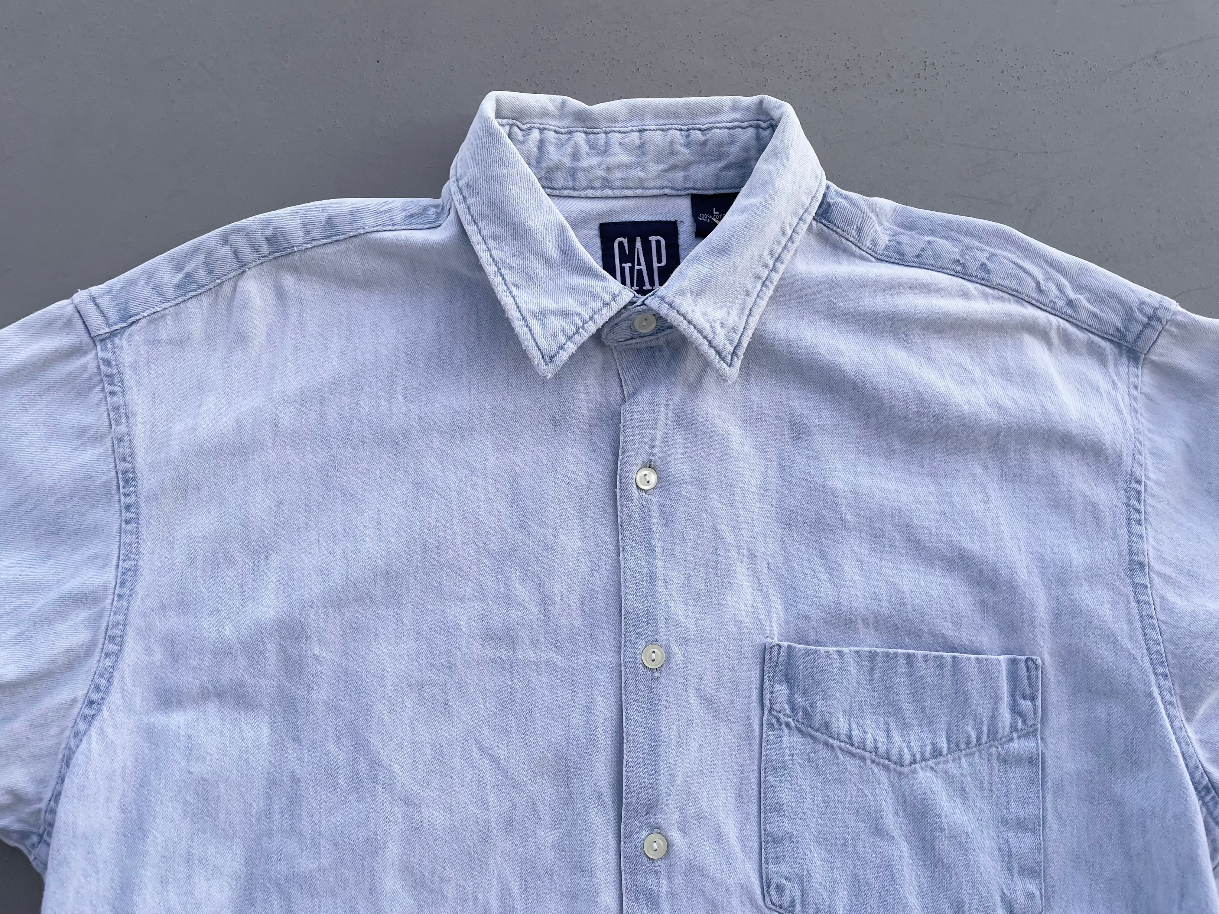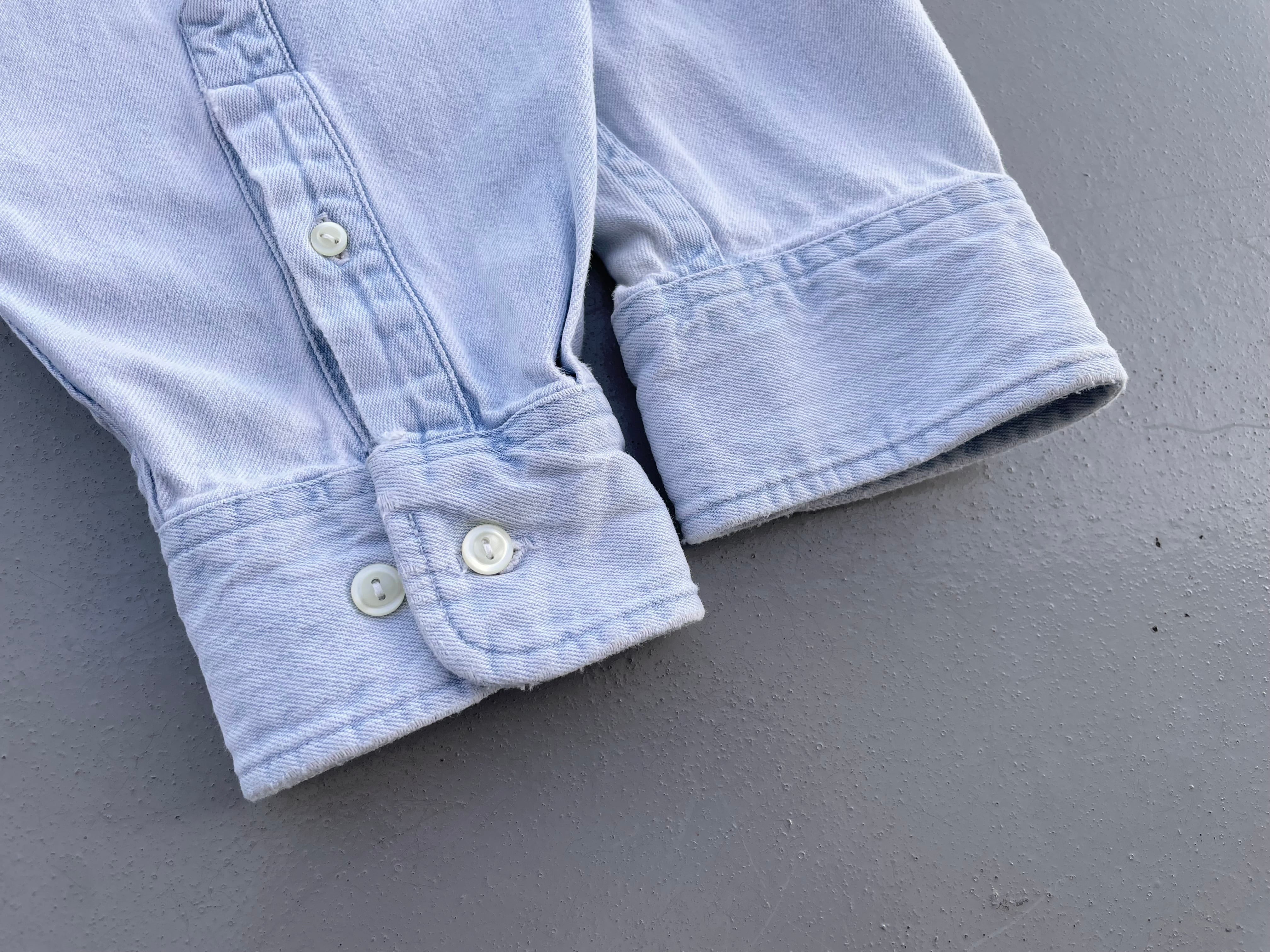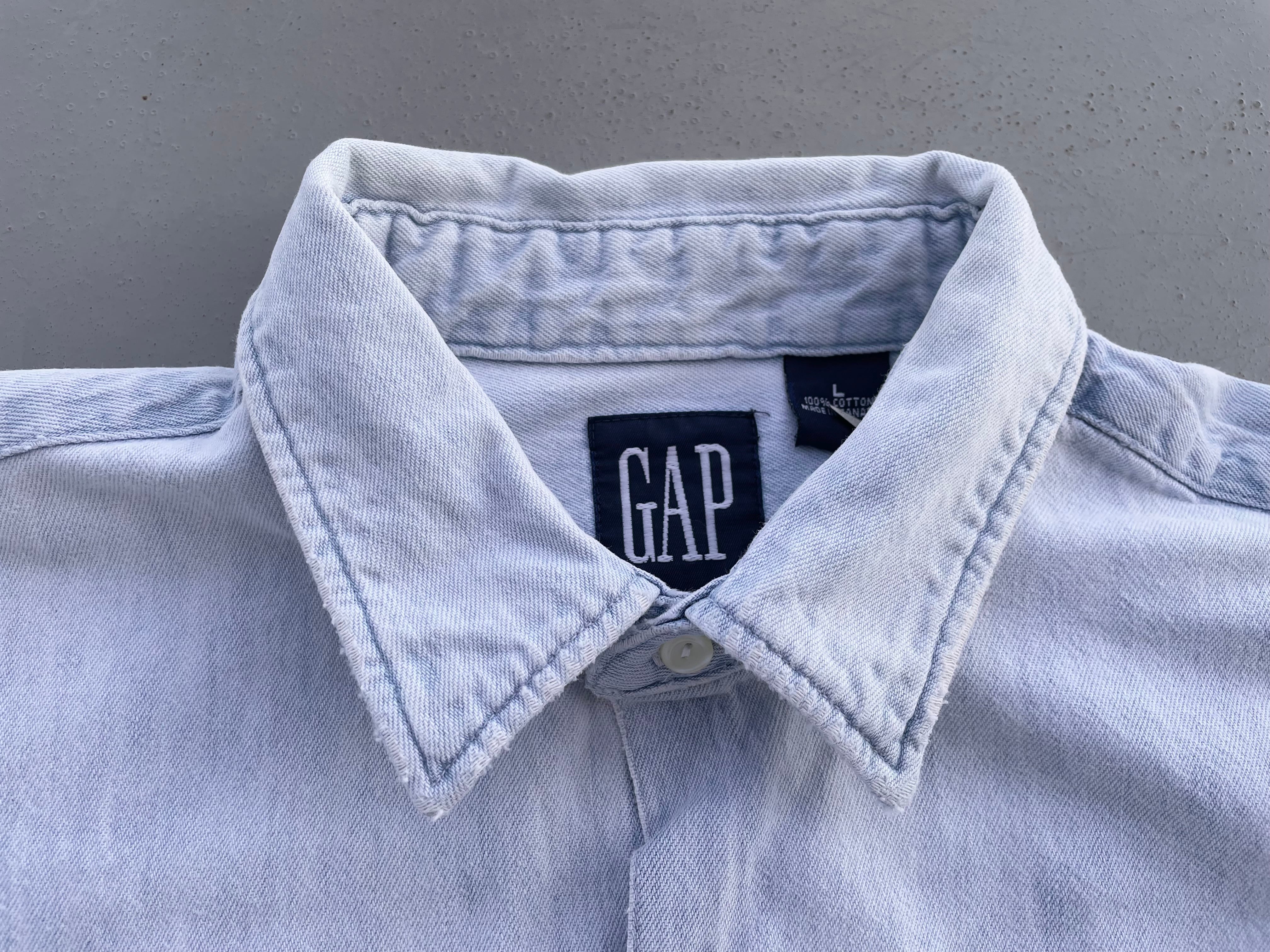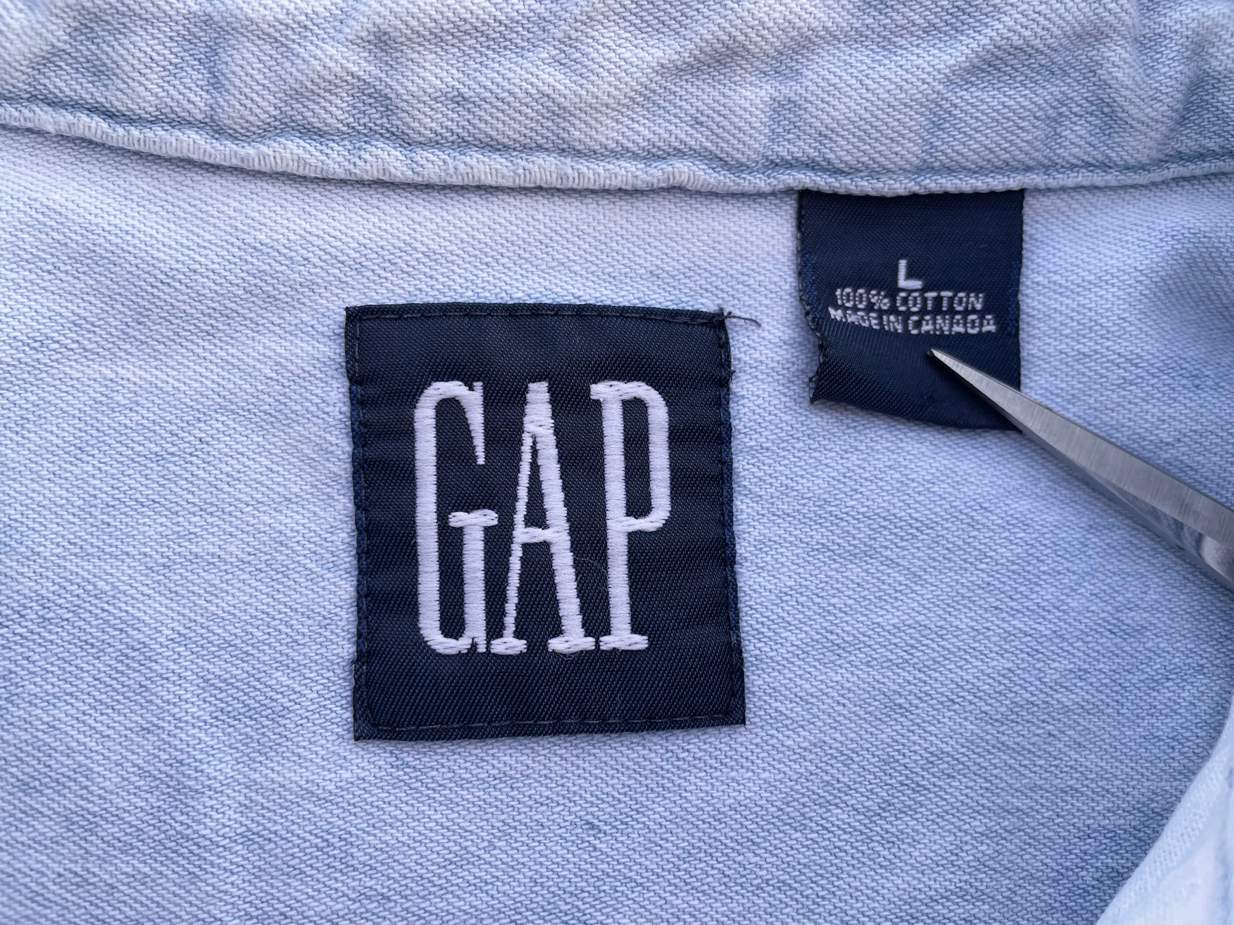 【商品詳細】ギャップのデニム長袖シャツ。サイズはL。カラーはアイスブルー。90年代カナダ製。90年代らしい出立ちのデニムシャツ。しっかり色の抜けたアイスブルーカラーと程良く使用感のある状態で雰囲気あります。ディテール良く着用時のシルエットが力抜けて良い感じです。