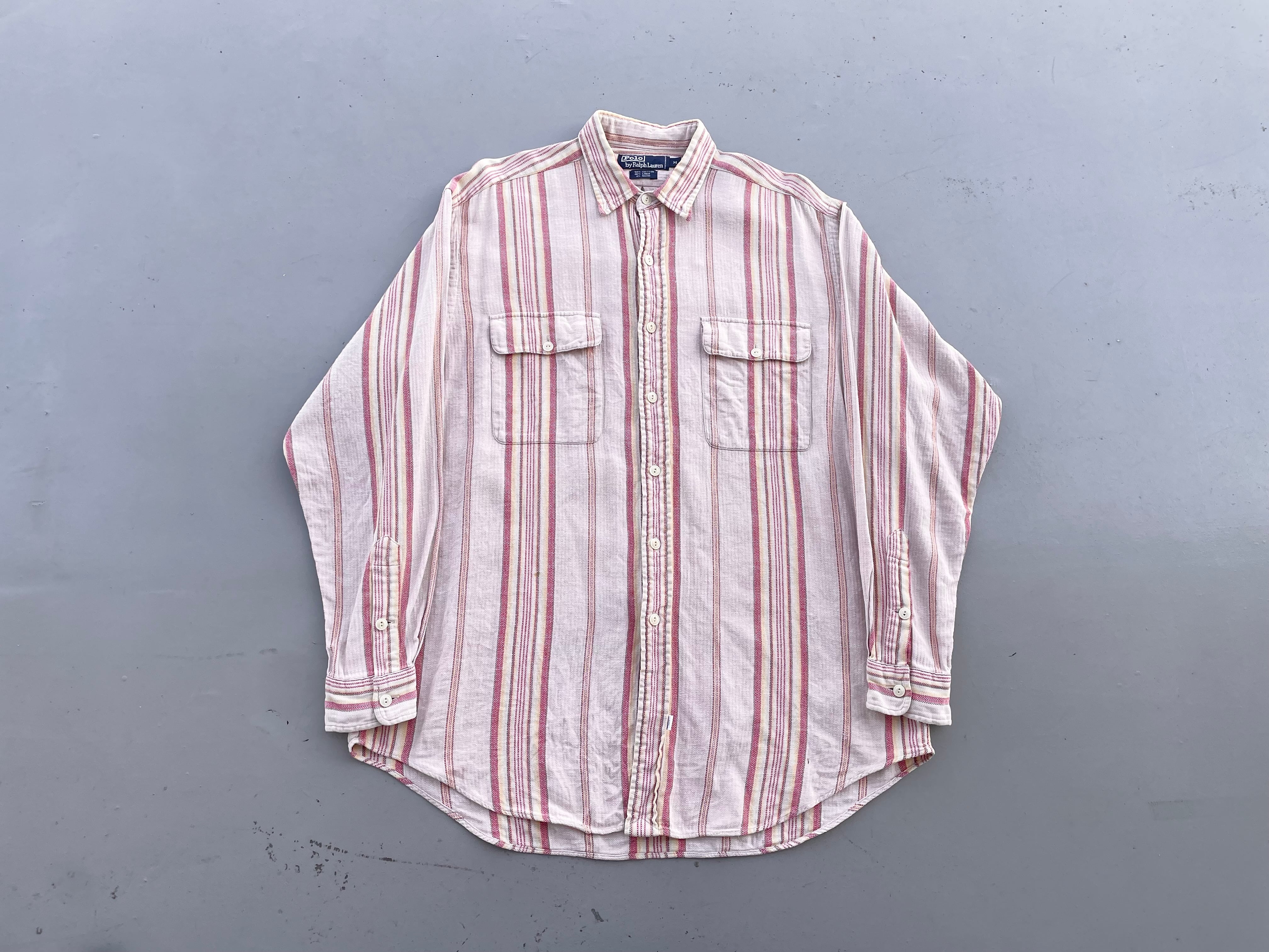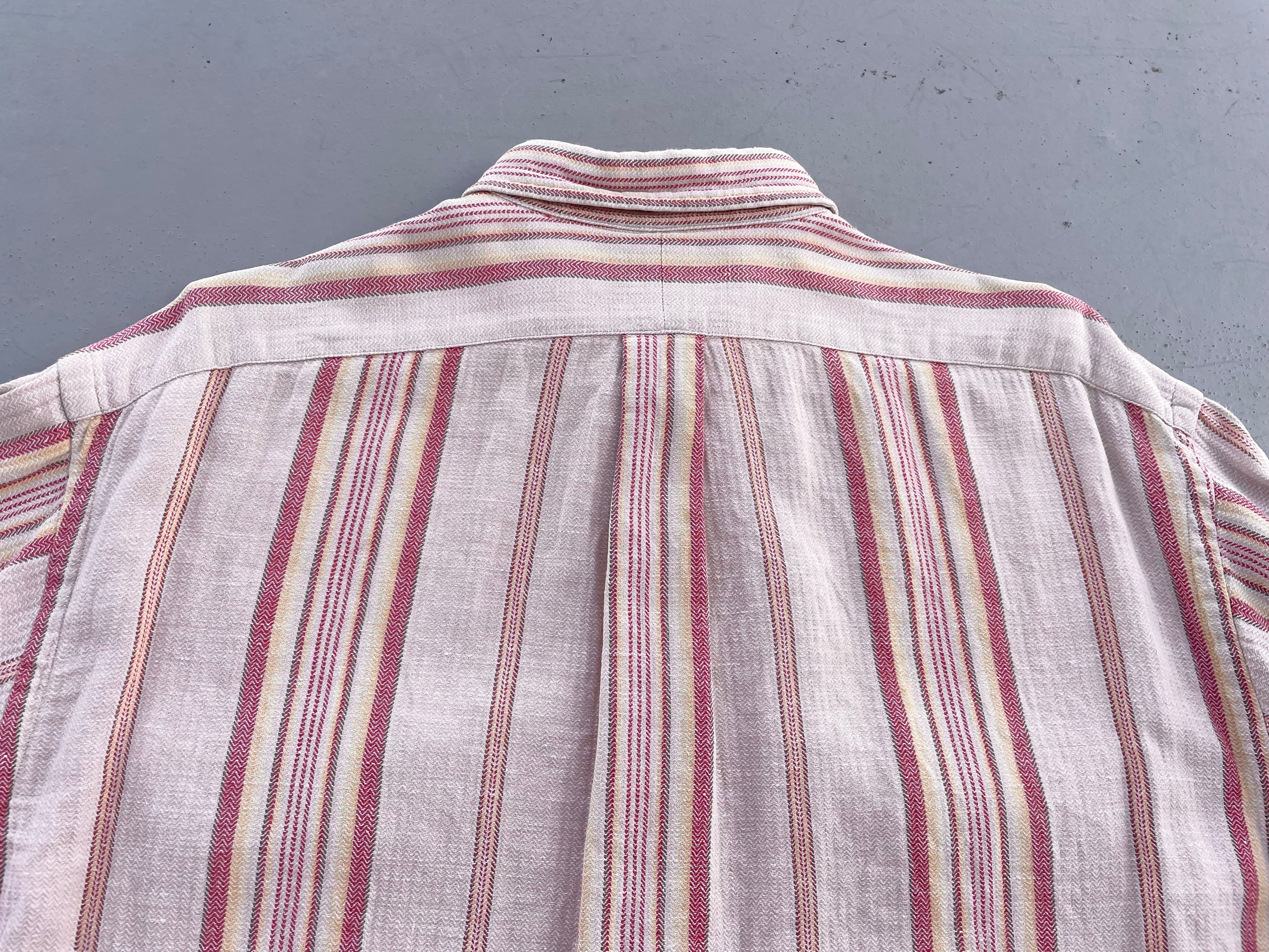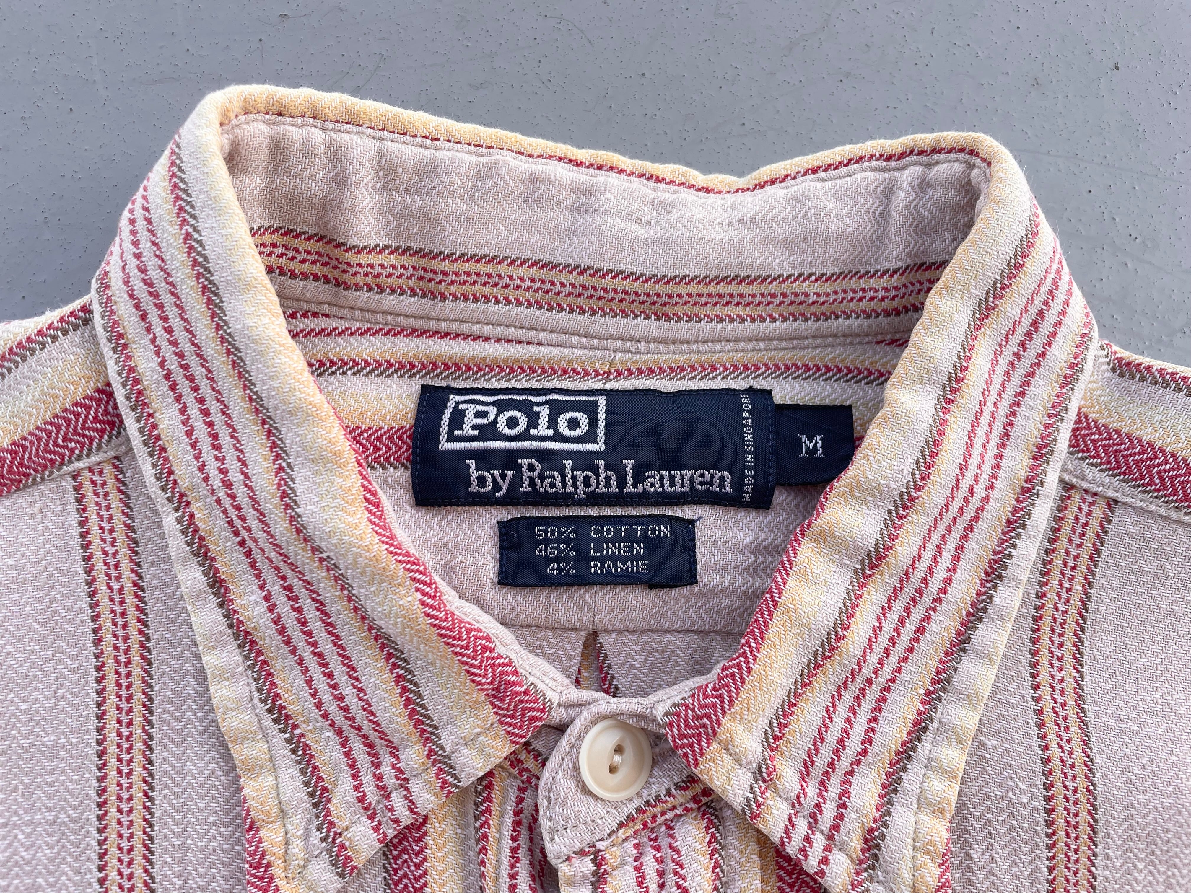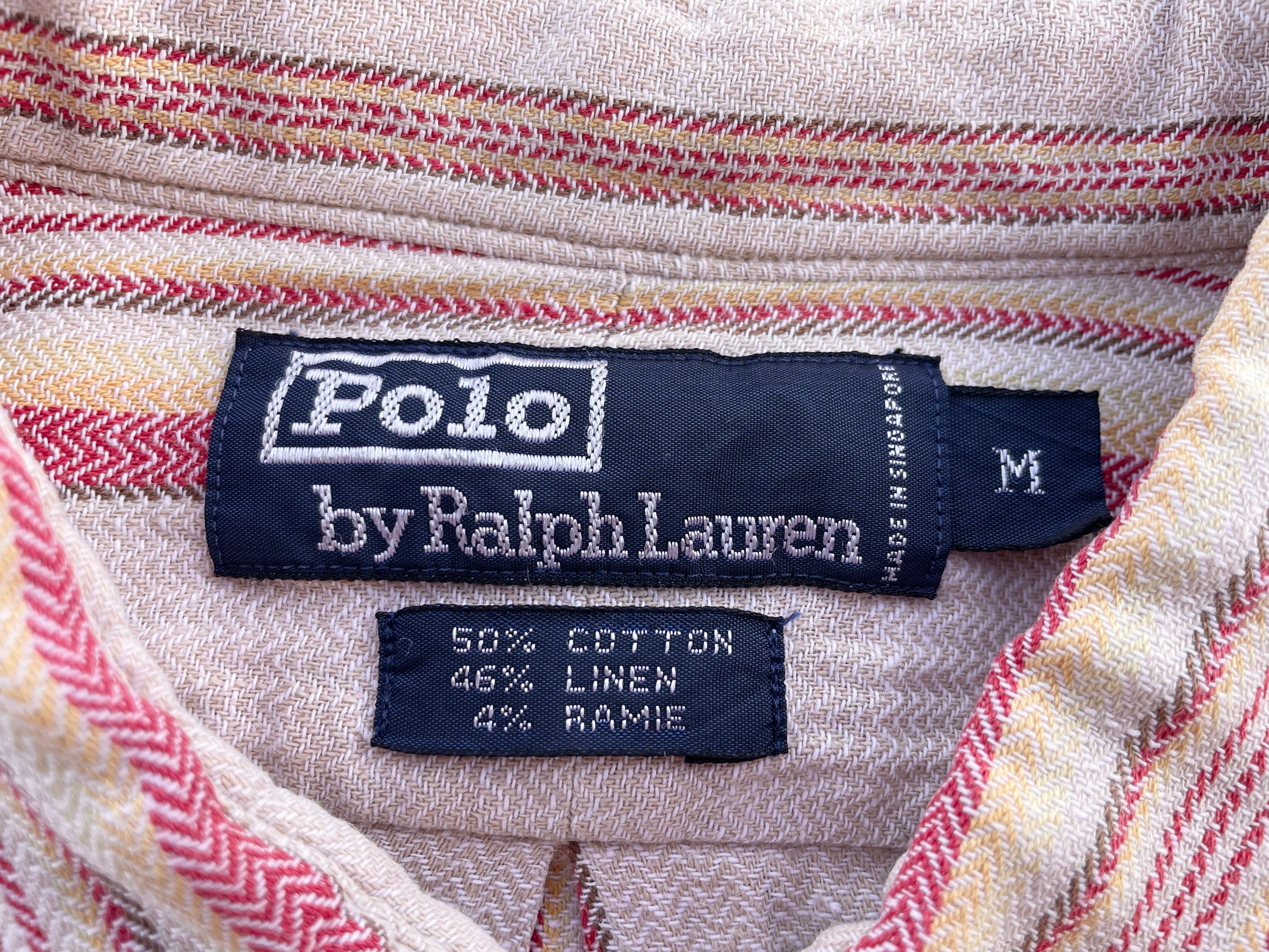 【商品詳細】ラルフローレンの長袖シャツ。サイズはM。カラーはサーモンピンクベースのストライプパターン。90年代シンガポール製。ヘリンボーン織+リネン・ラミー混のラルフらしい変わり種系シャツ。Mサイズですが実寸の通り大きめな作り。地味に猫目ボタンなのも嬉しいです。