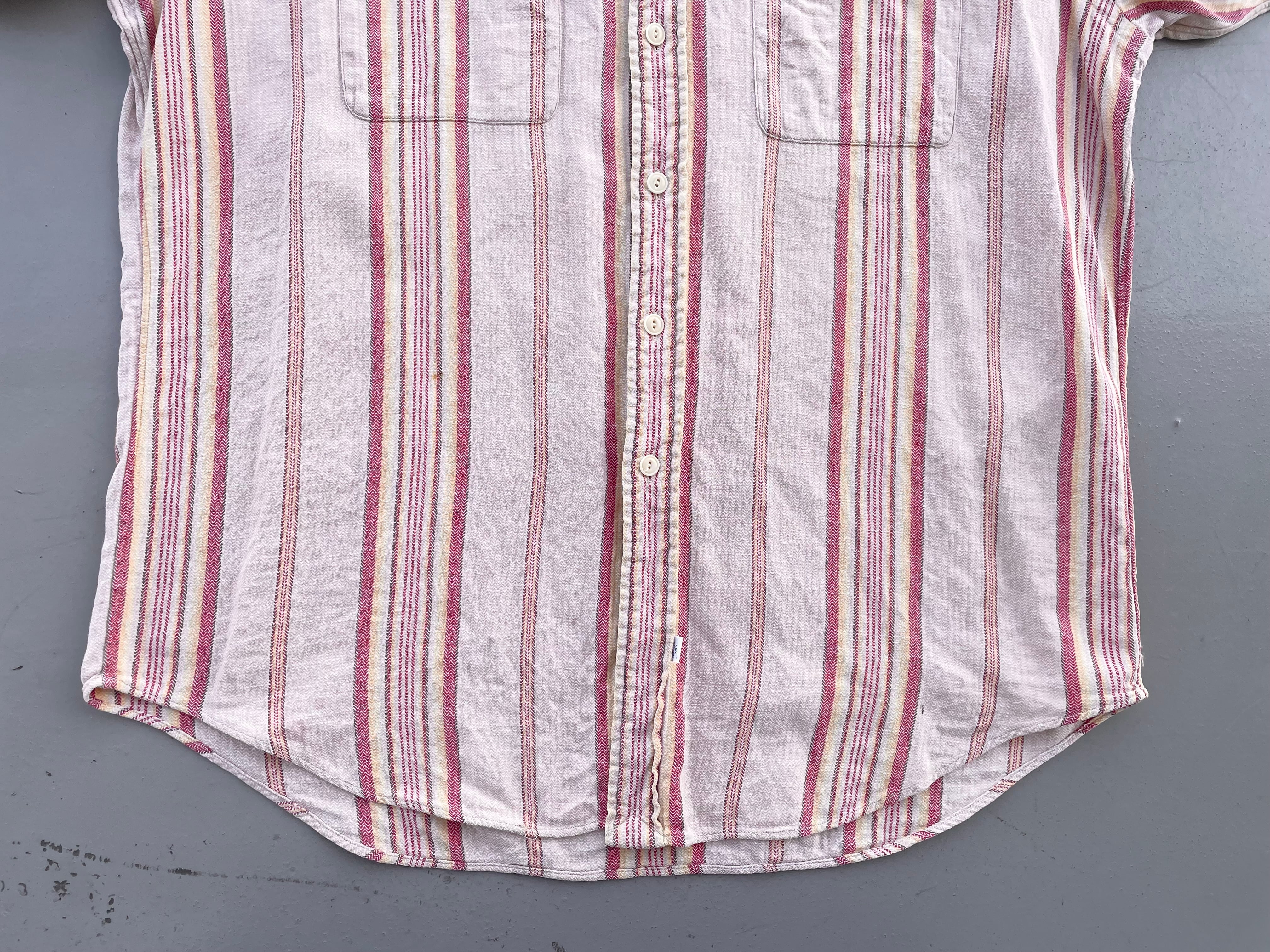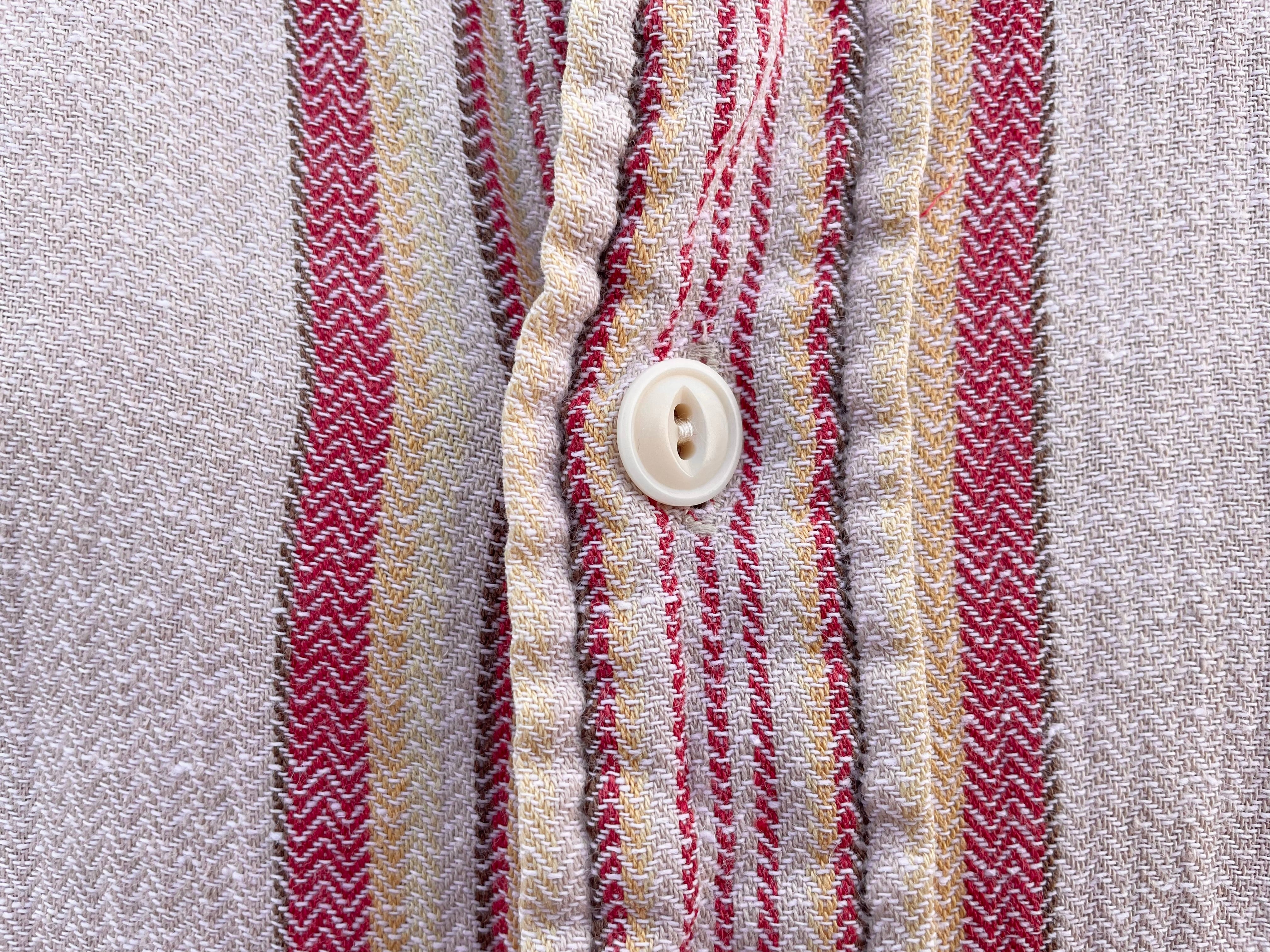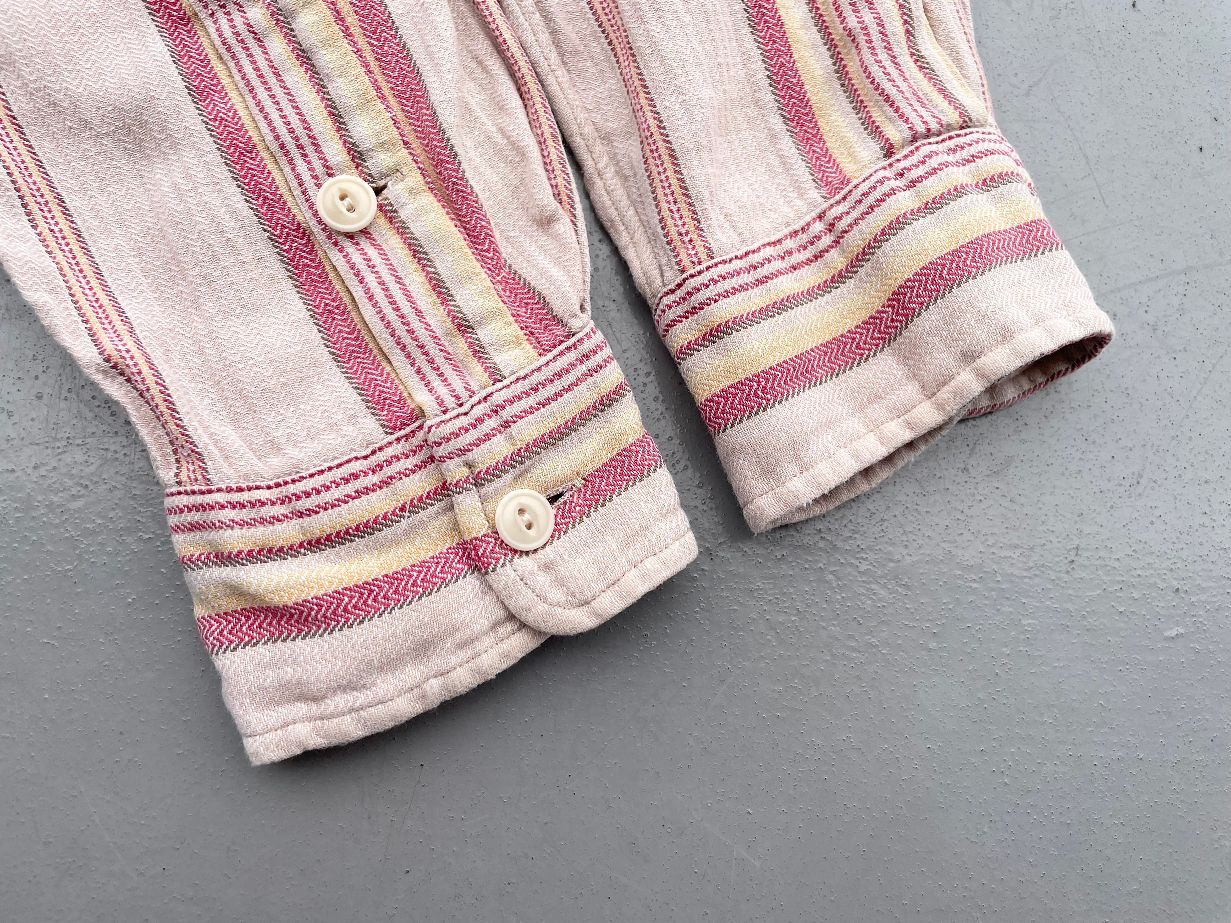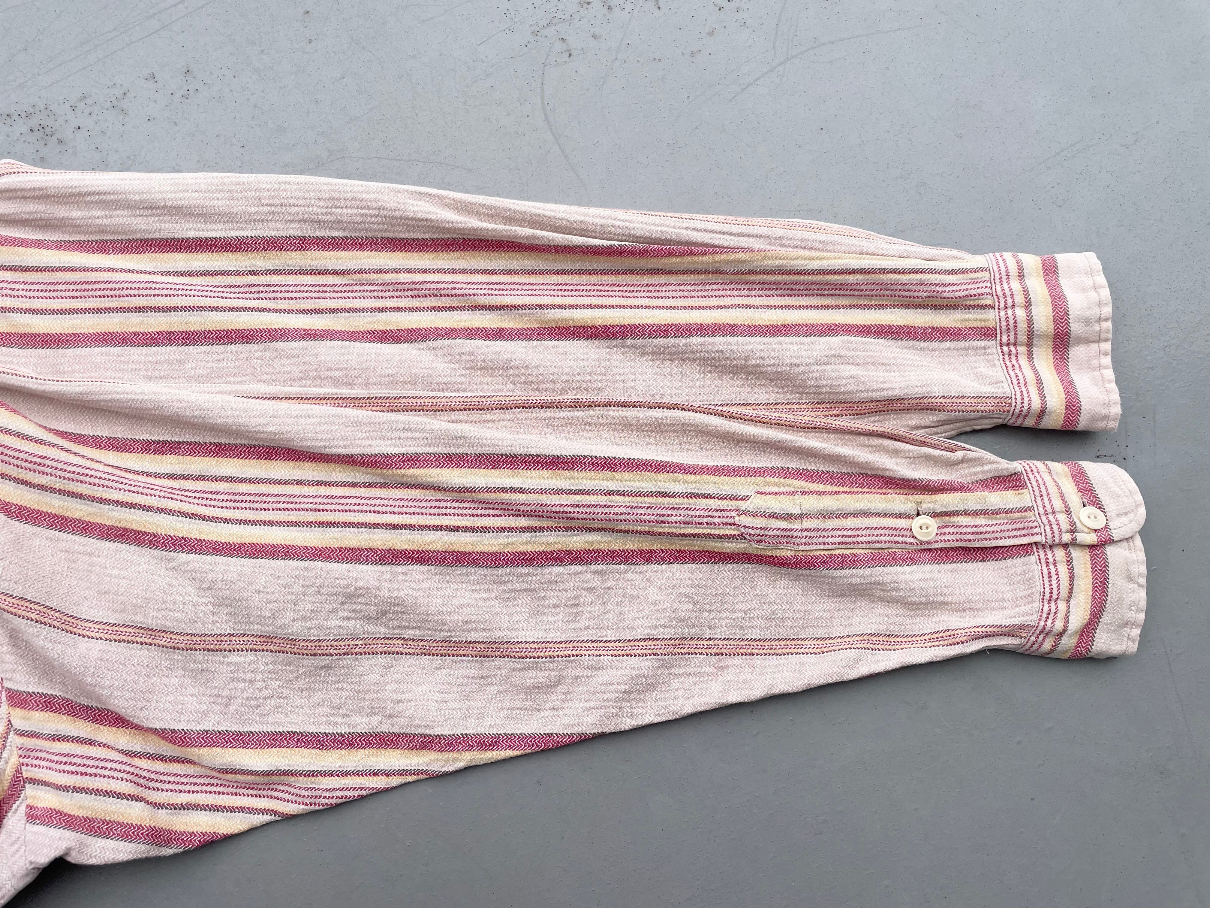 【商品詳細】ラルフローレンの長袖シャツ。サイズはM。カラーはサーモンピンクベースのストライプパターン。90年代シンガポール製。ヘリンボーン織+リネン・ラミー混のラルフらしい変わり種系シャツ。Mサイズですが実寸の通り大きめな作り。地味に猫目ボタンなのも嬉しいです。