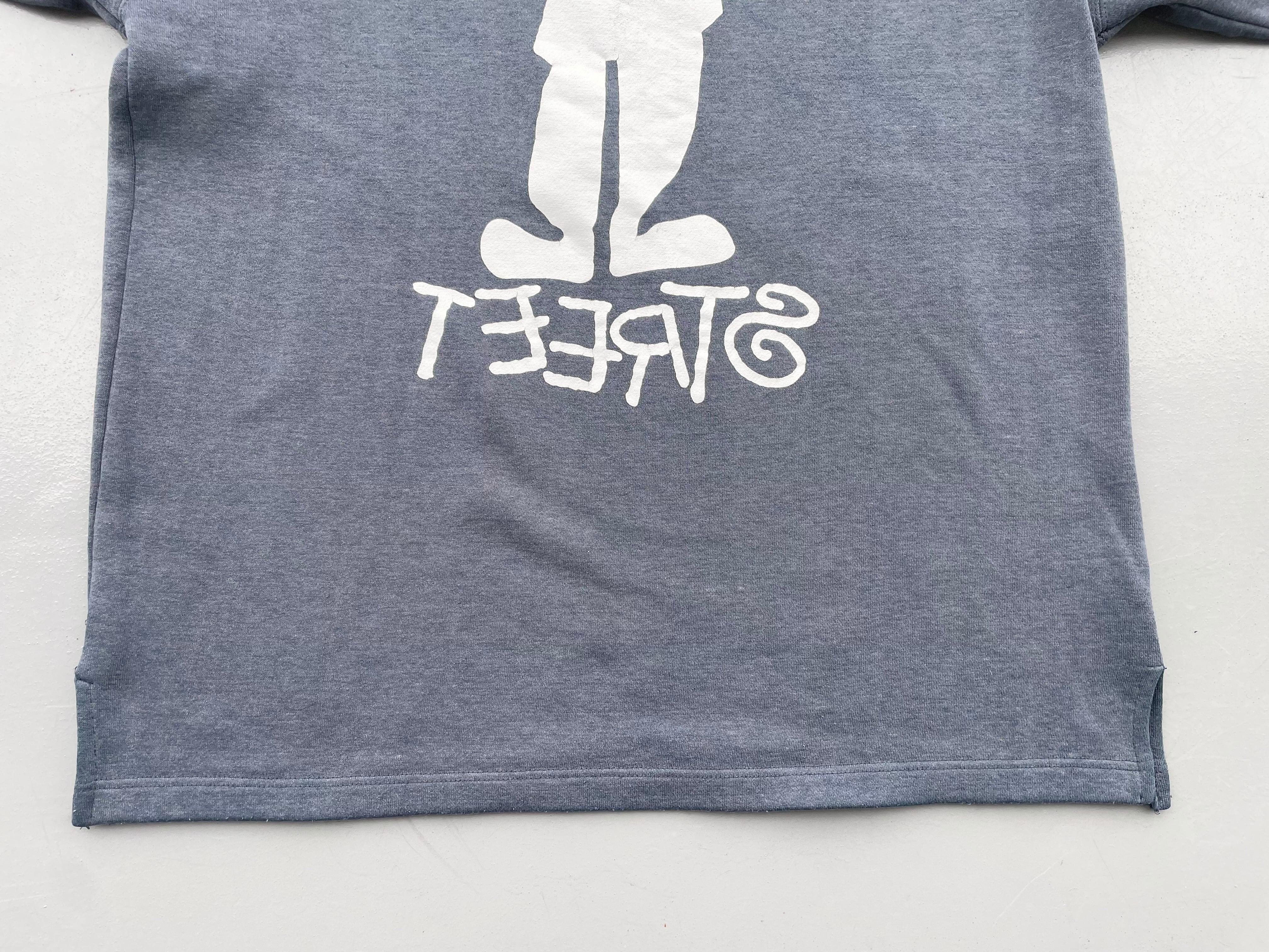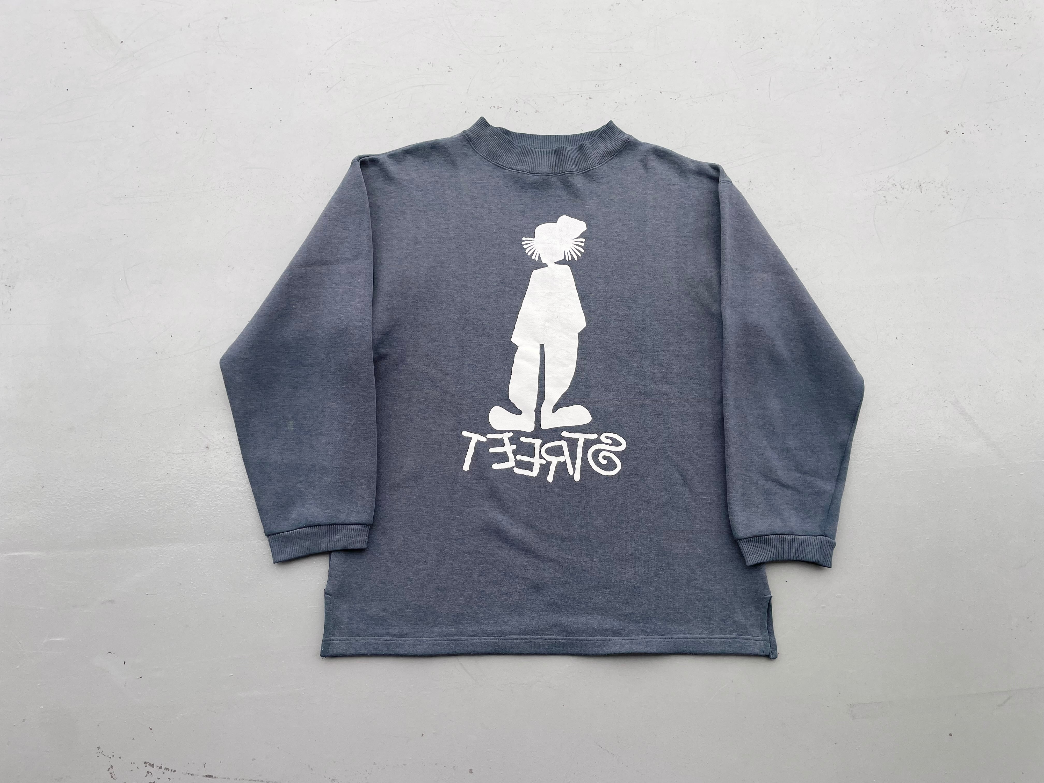 【商品詳細】ヴィンテージの長袖スウェット。サイズは実寸L-XL程。カラーはグレー。90-00年製。シャドーマンとSTREETをミラーリングしたパロディ物。オールドな雰囲気の袖リブやモックネックのディテールも気が利いてグッドです。かすれたようなグレーカラーも洒落てます。