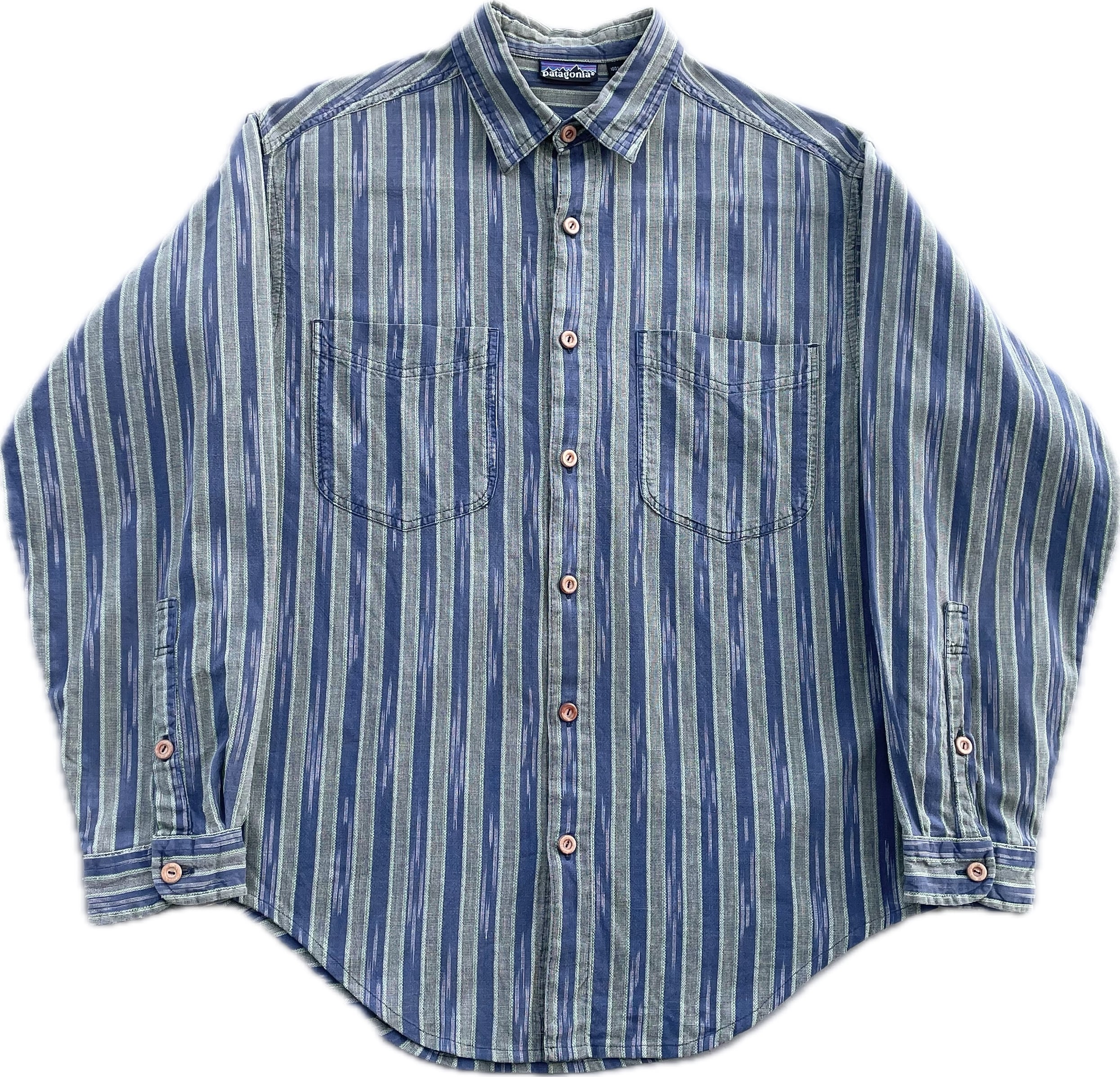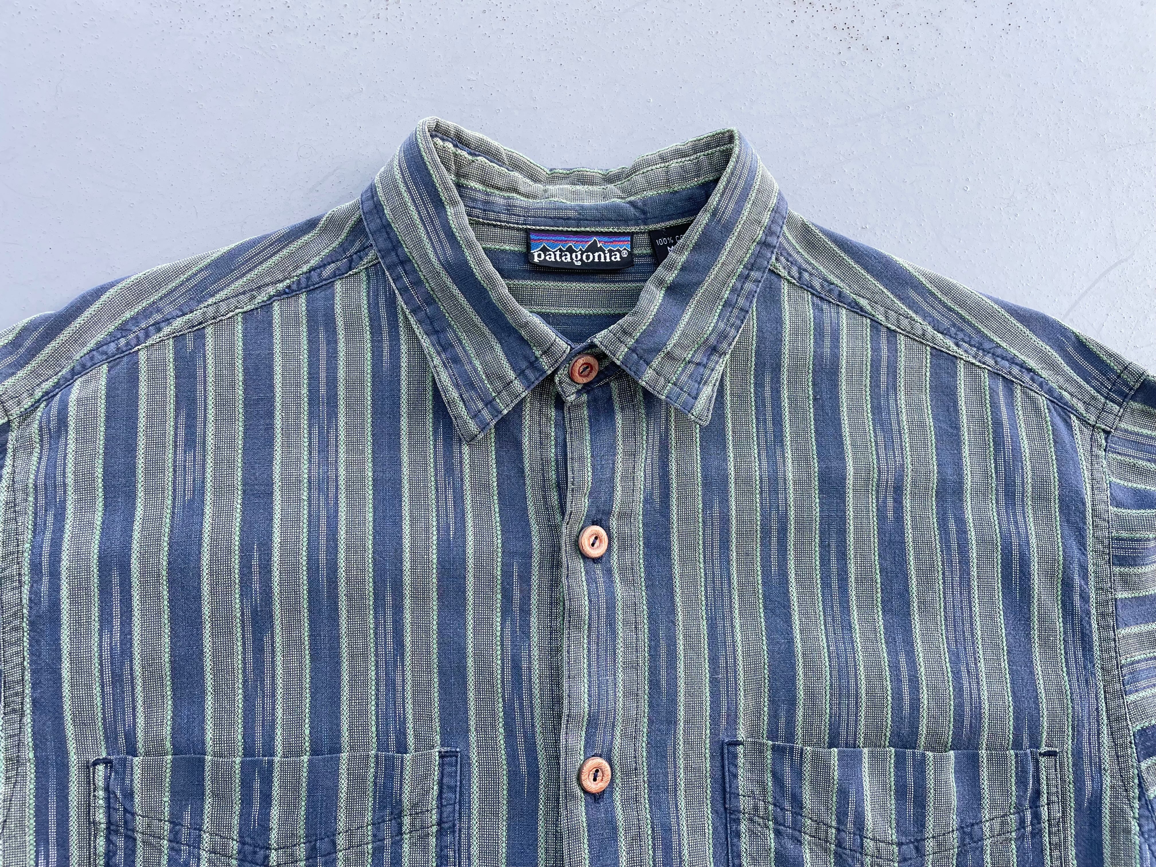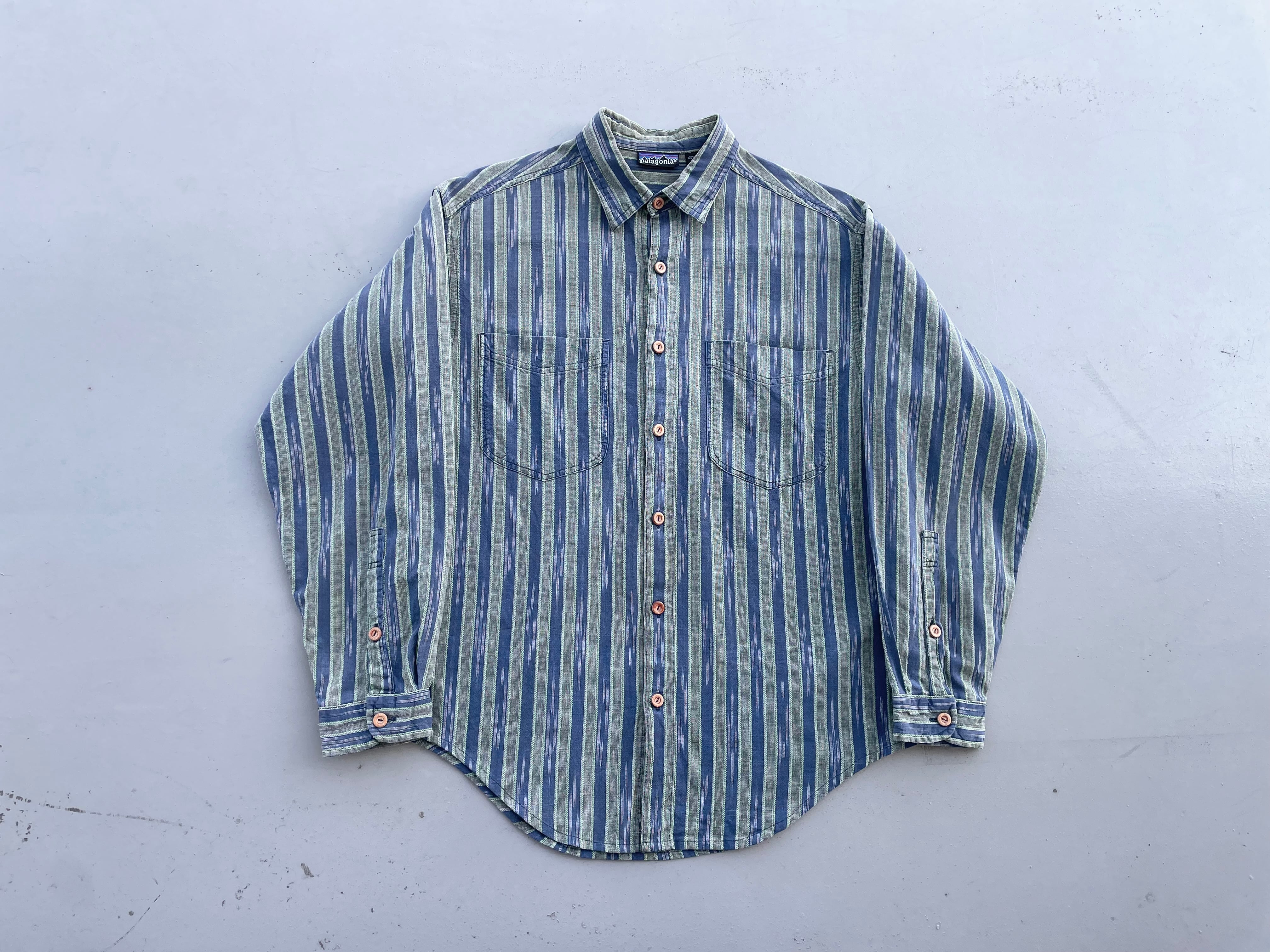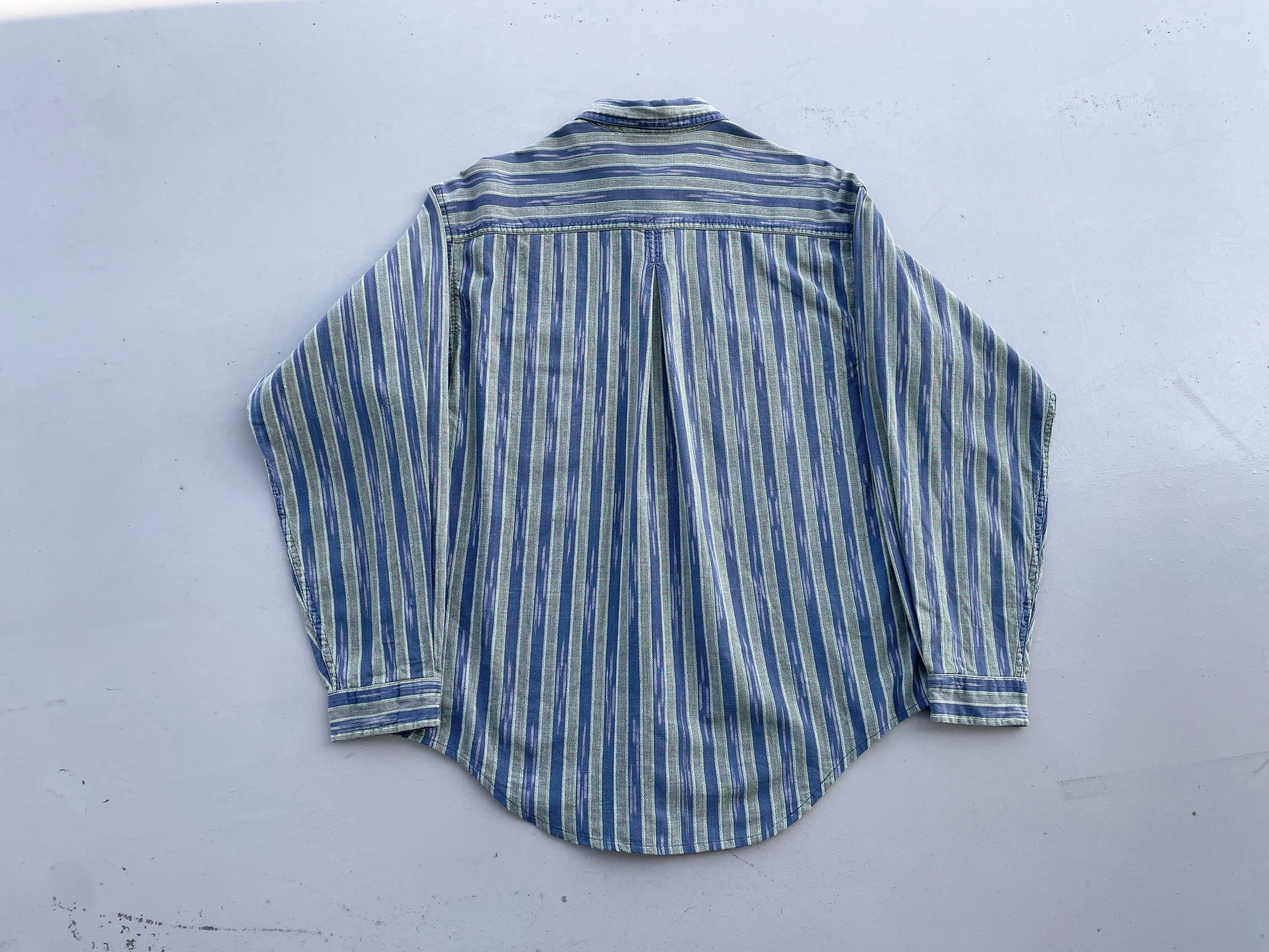 【商品詳細】パタゴニアの長袖シャツ。サイズはS。カラーはネイビー×オリーブベースのストライプパターン。91年マカオ製。かすれたようなネイティブ模様が入るストライプシャツ。和モダンな玄人配色が洒落てます。