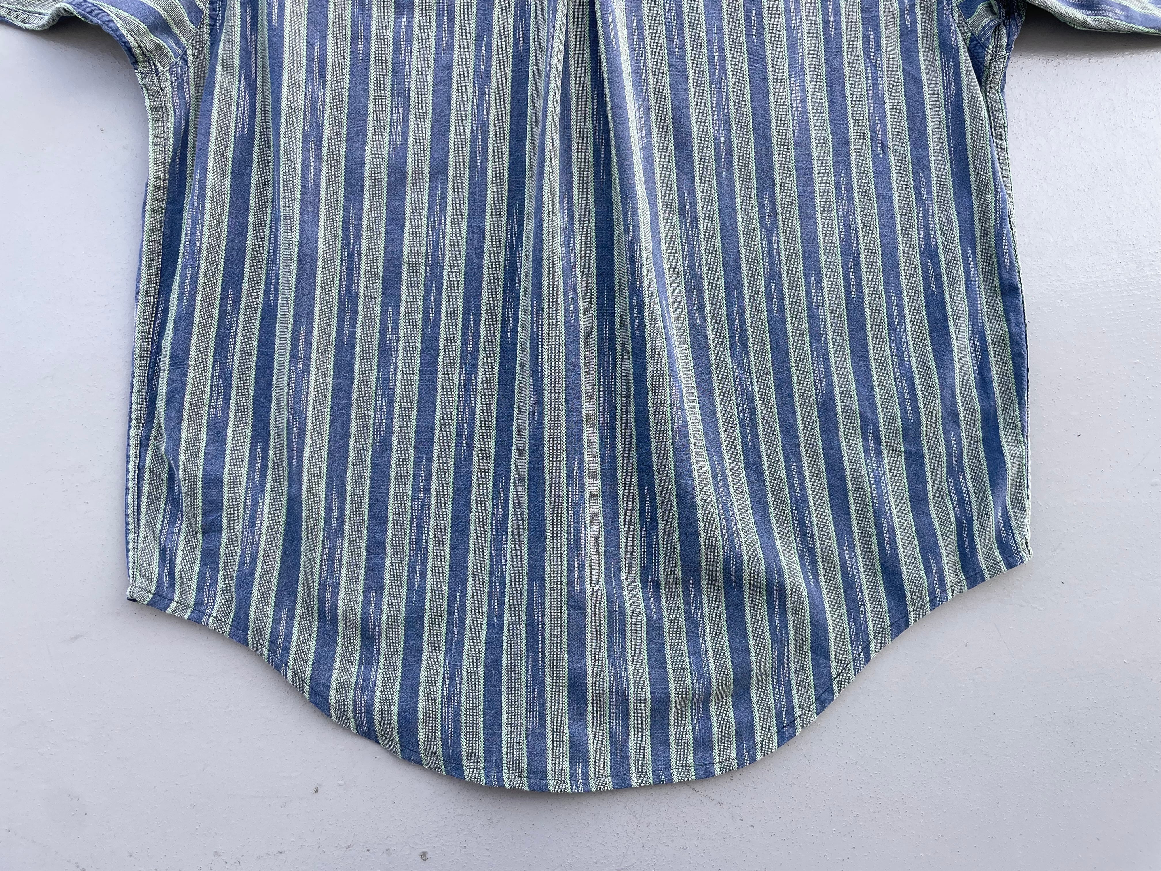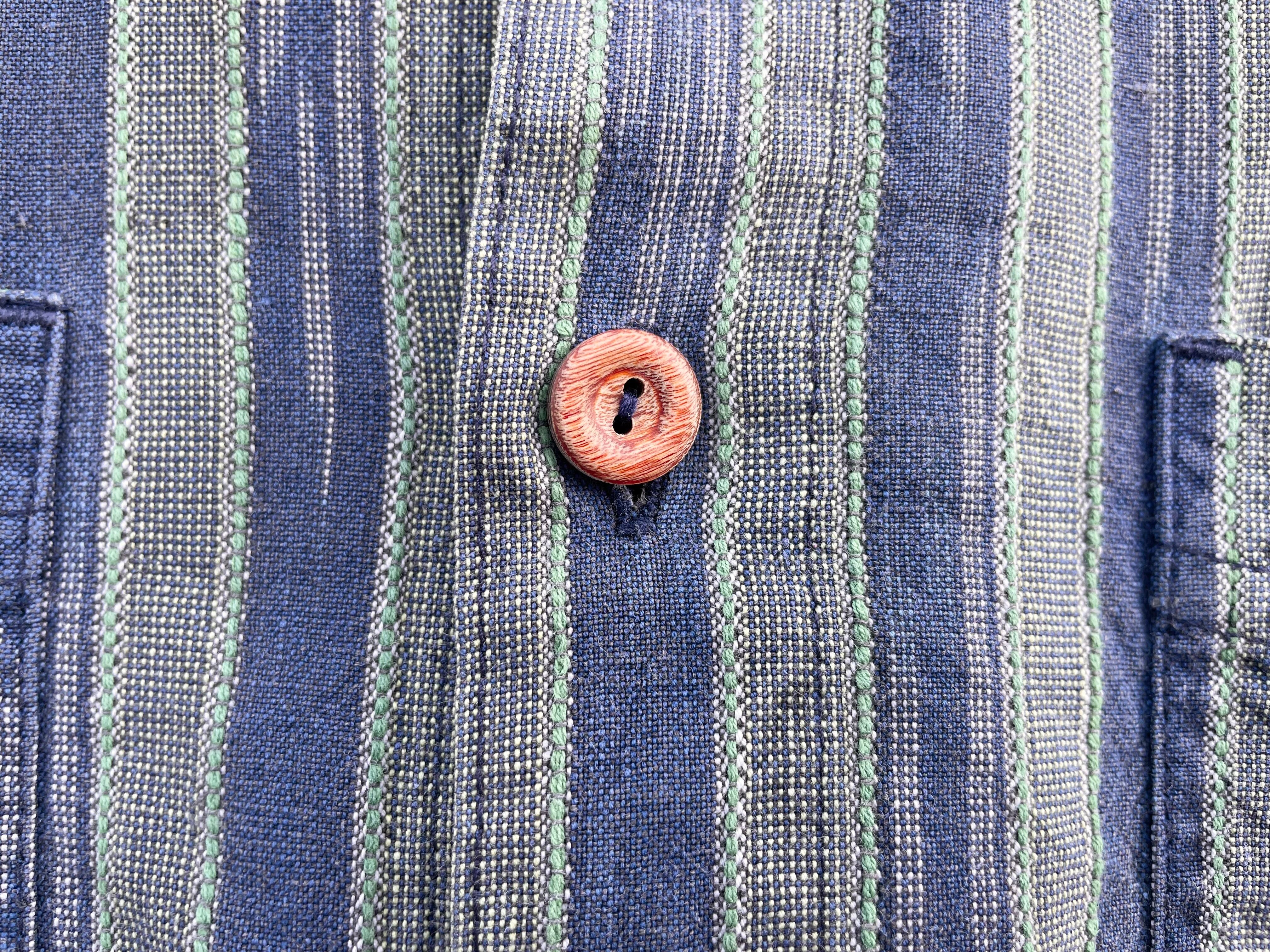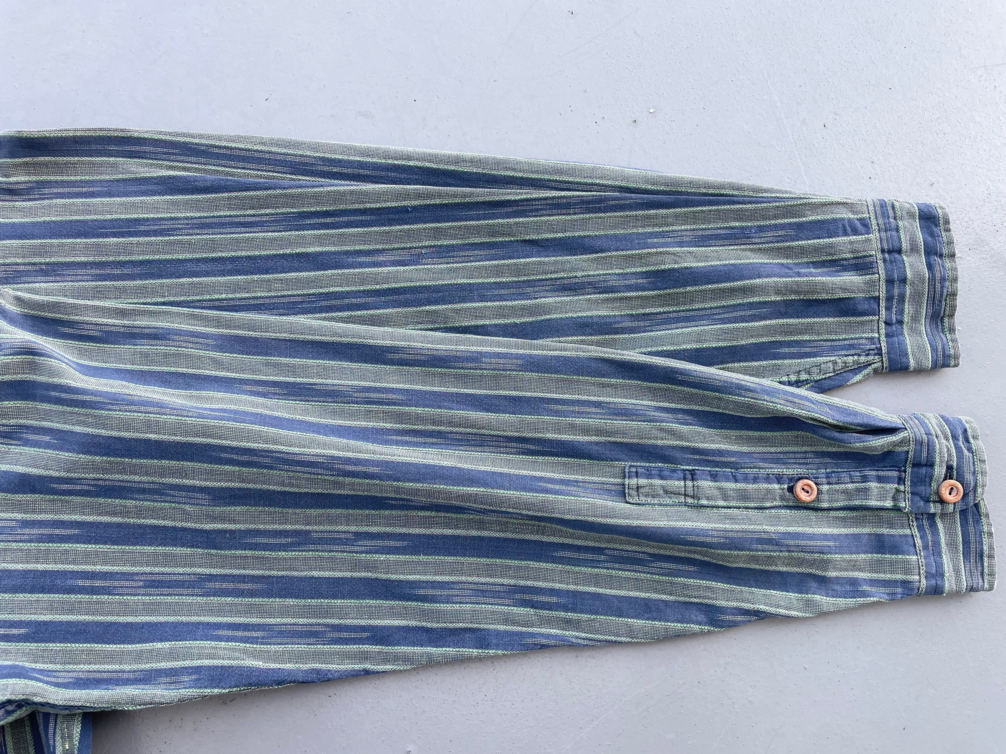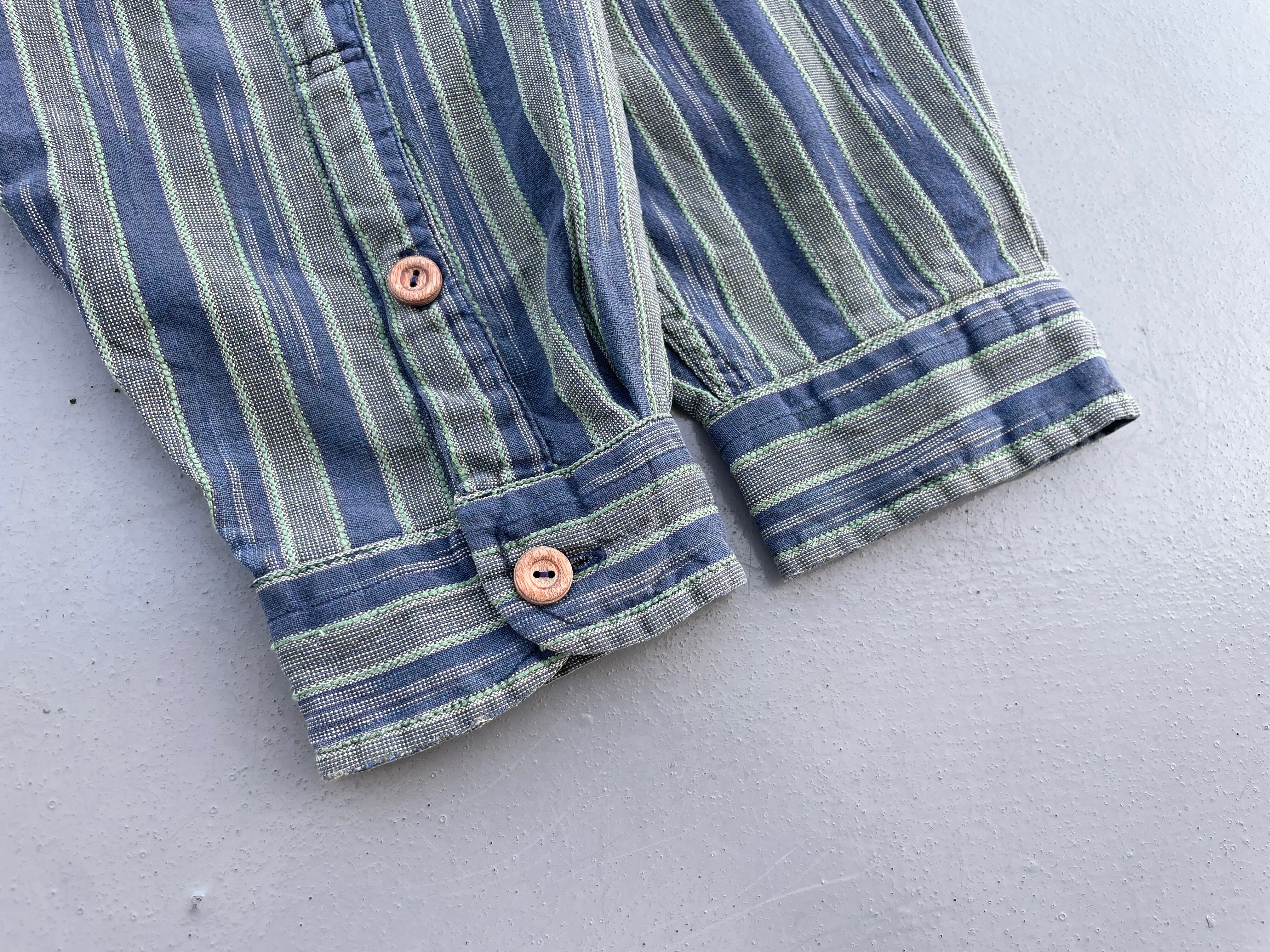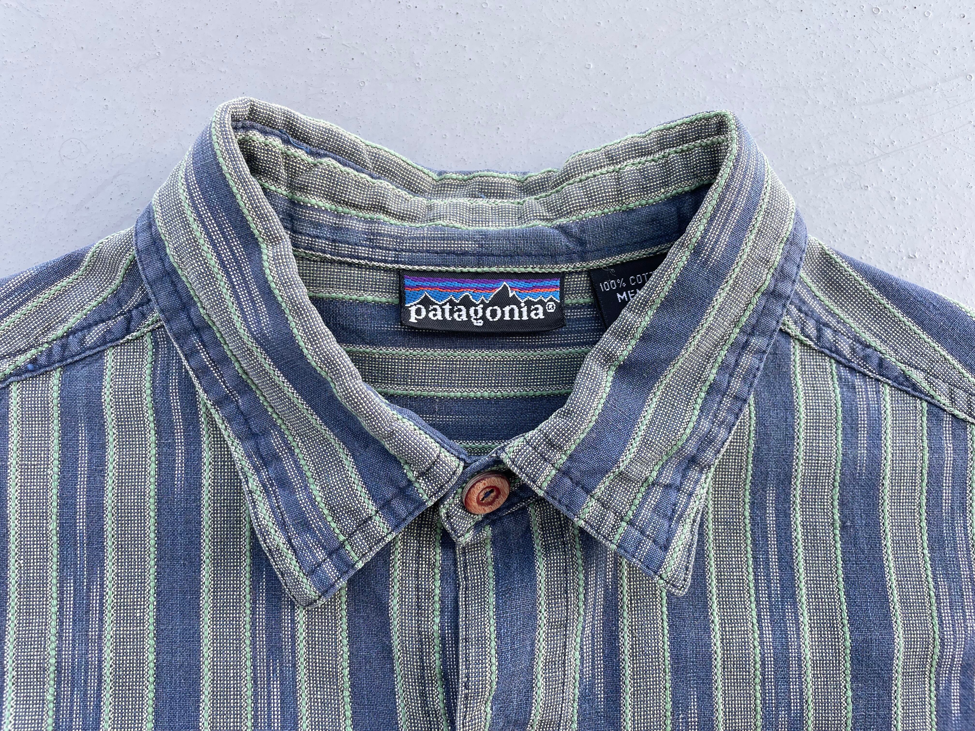【商品詳細】パタゴニアの長袖シャツ。サイズはS。カラーはネイビー×オリーブベースのストライプパターン。91年マカオ製。かすれたようなネイティブ模様が入るストライプシャツ。和モダンな玄人配色が洒落てます。