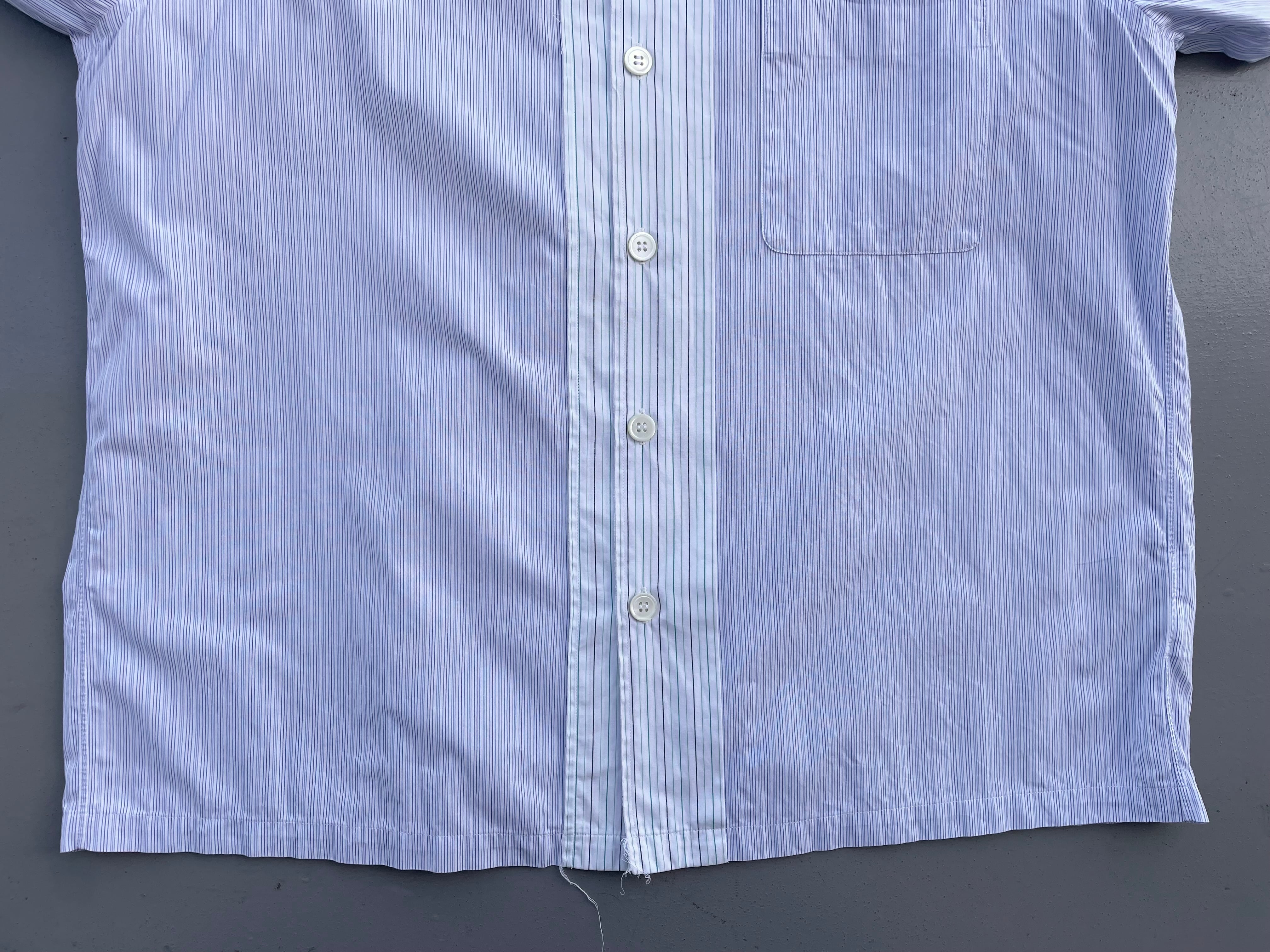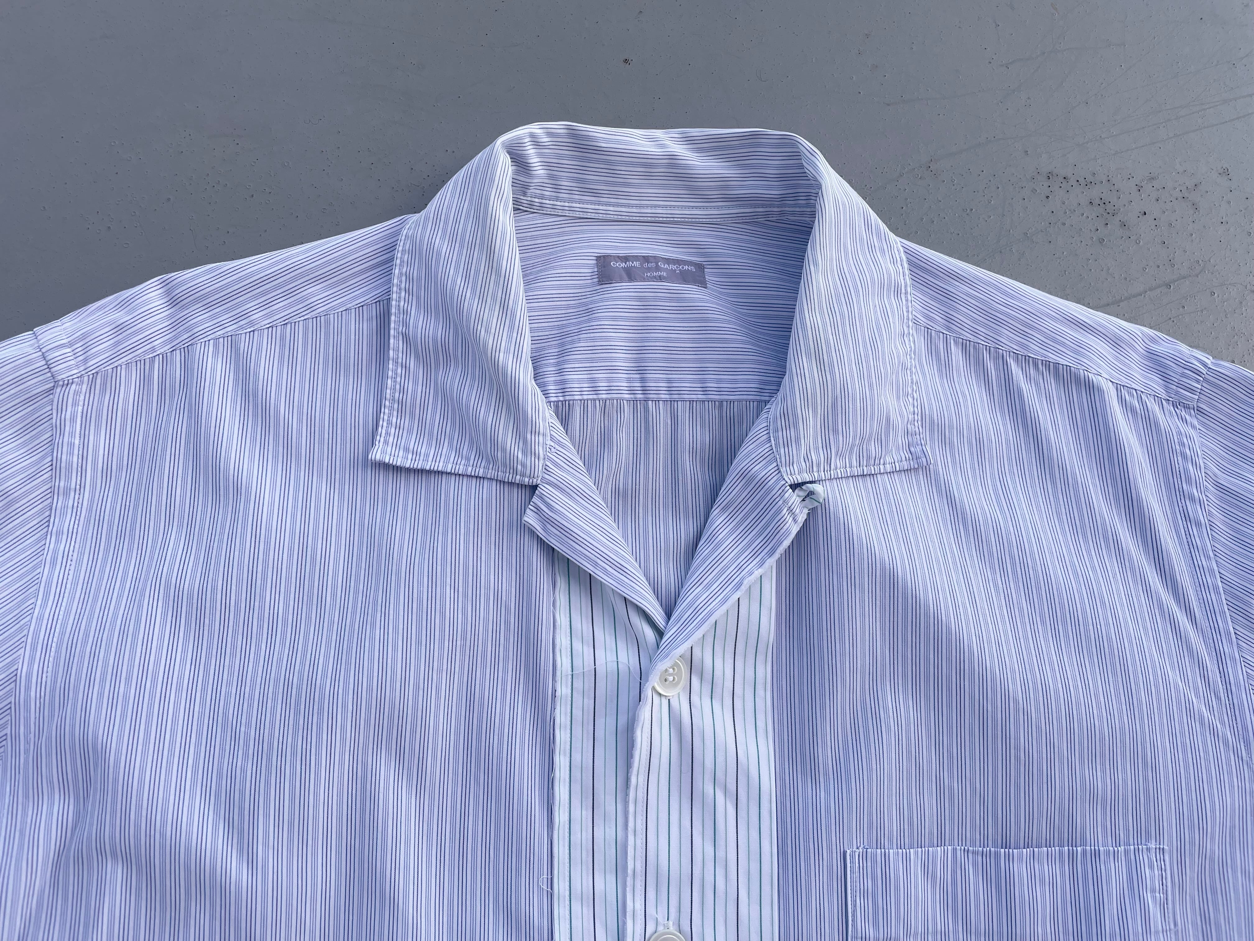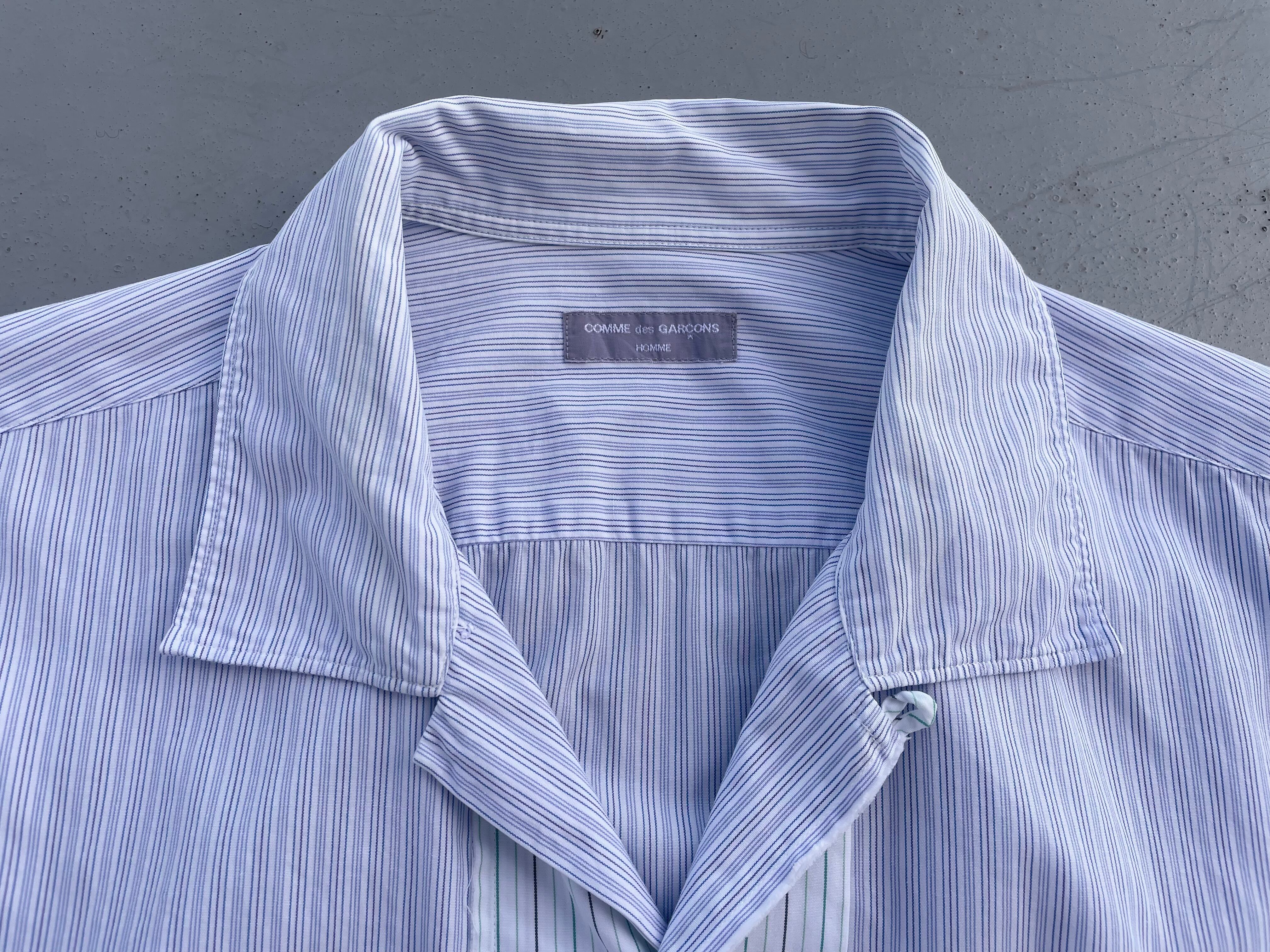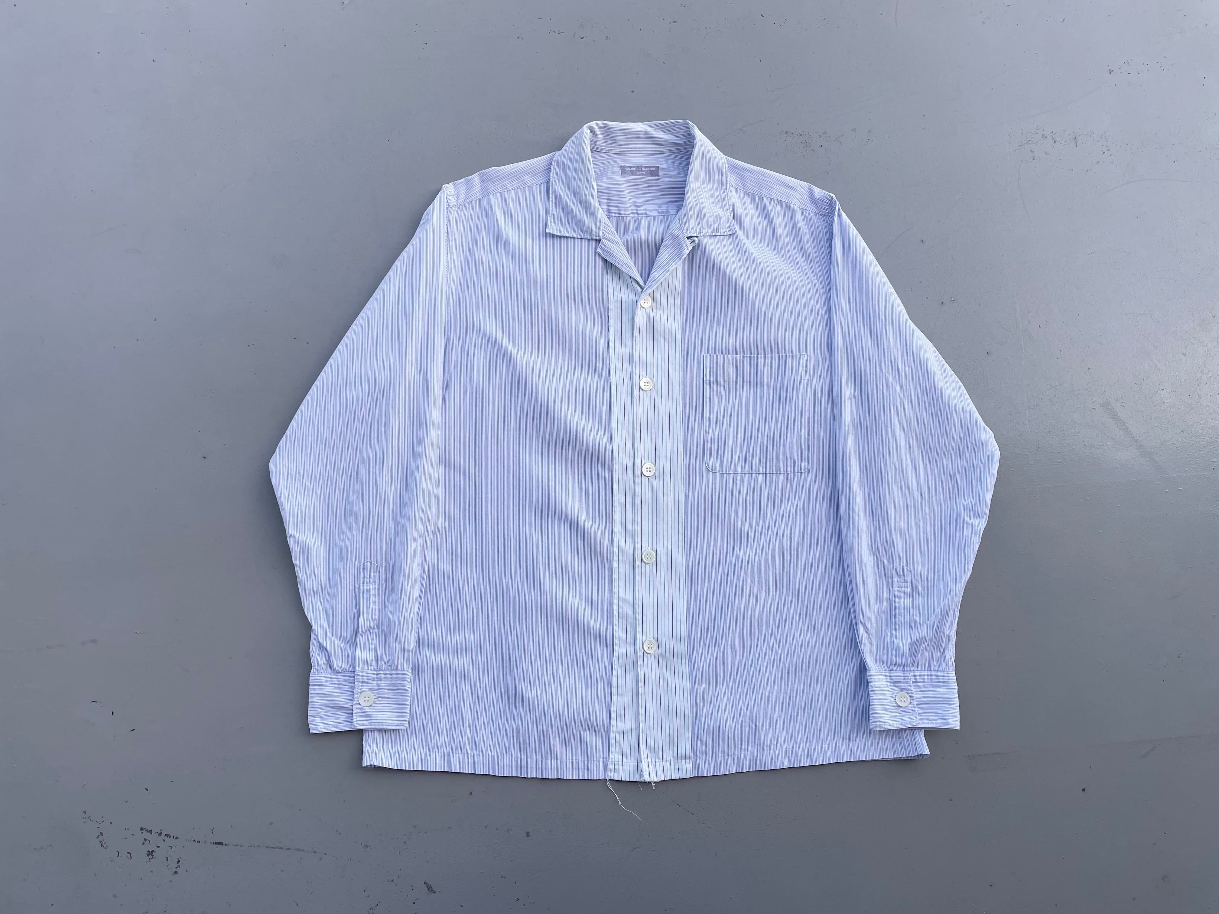 【商品詳細】コムデギャルソン オムのオーバーサイズシャツ。サイズはFREE。カラーはブルーベースのストライプパターン。00年日本製。田中オム期人気のシャツ物。センターボタン付近で切り替えがなされた洒落た一着。ほつれ加工やデカボタン等ギャルソンらしいデザインとディテールに仕上がってます。
