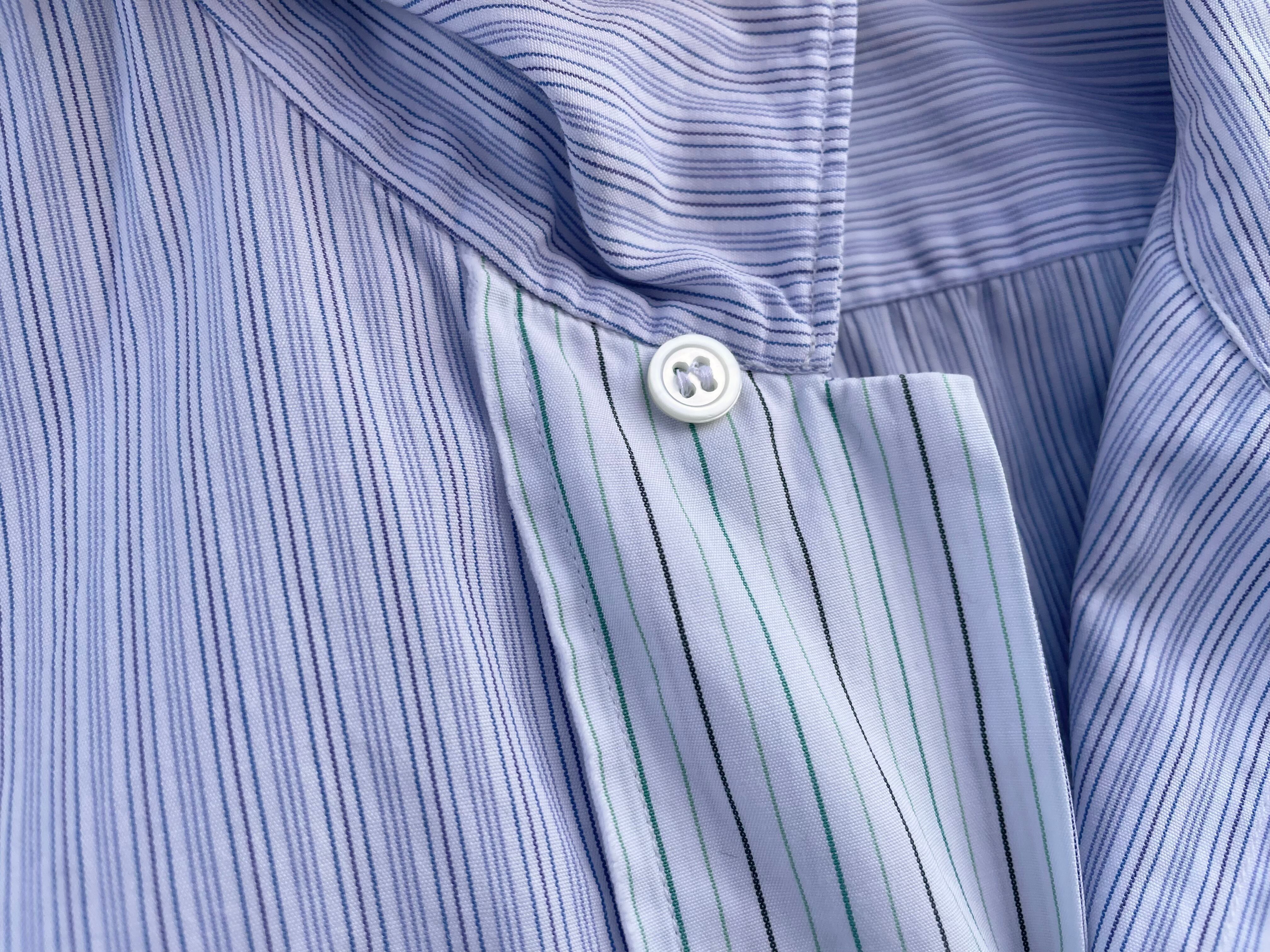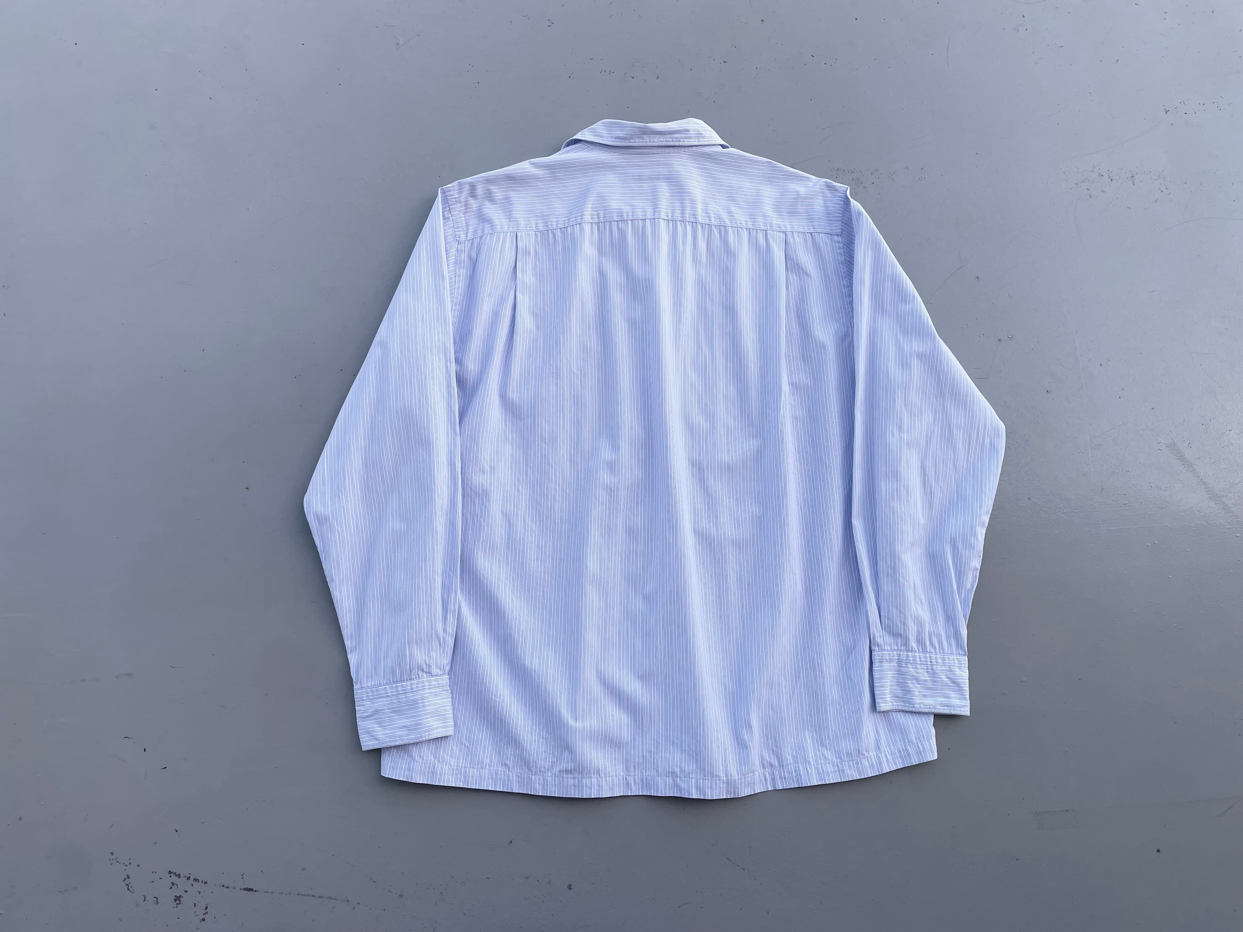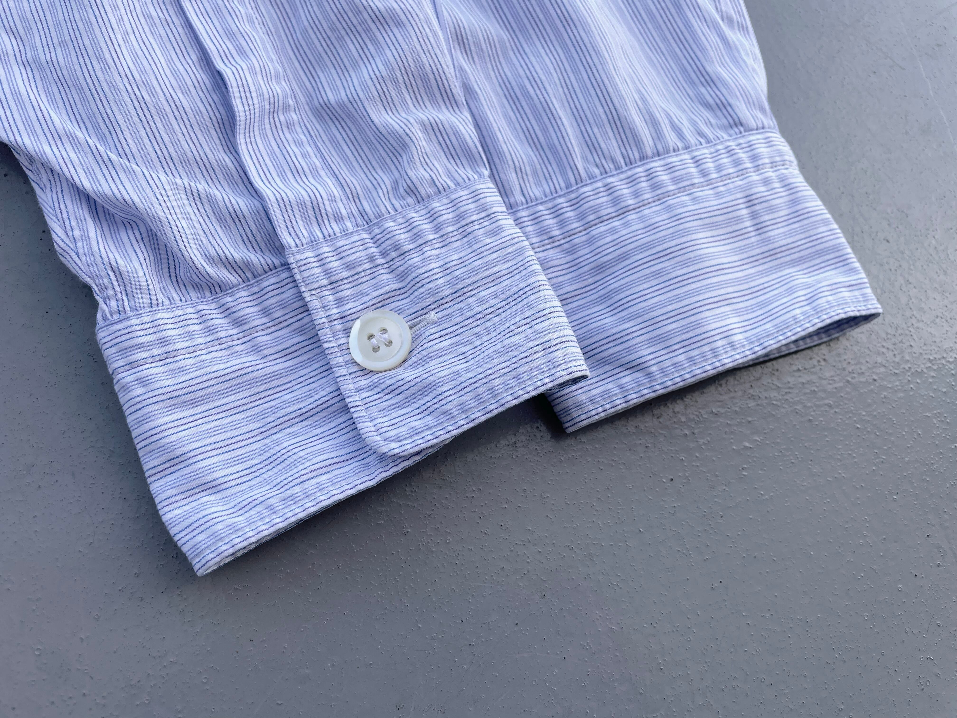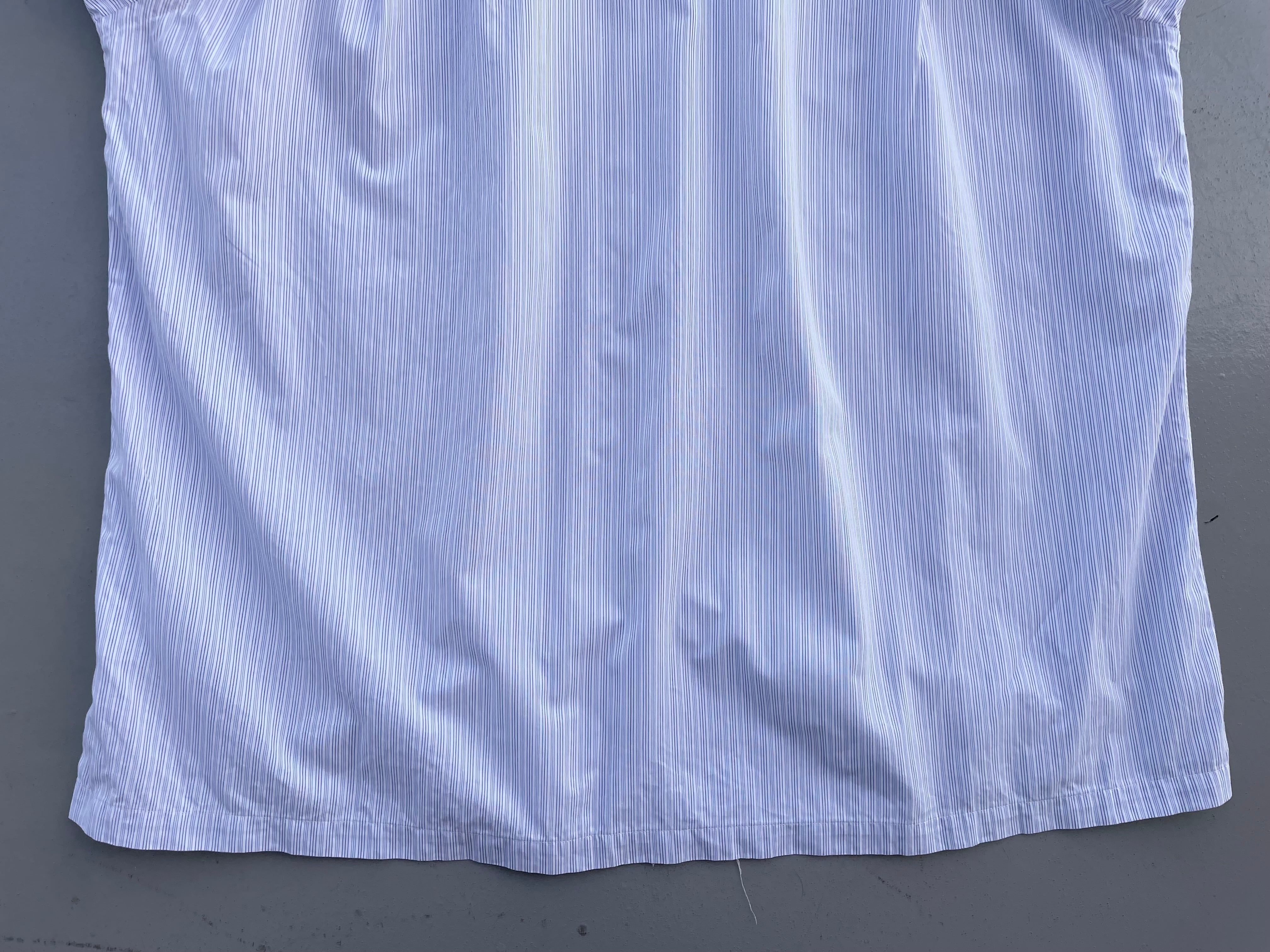 【商品詳細】コムデギャルソン オムのオーバーサイズシャツ。サイズはFREE。カラーはブルーベースのストライプパターン。00年日本製。田中オム期人気のシャツ物。センターボタン付近で切り替えがなされた洒落た一着。ほつれ加工やデカボタン等ギャルソンらしいデザインとディテールに仕上がってます。