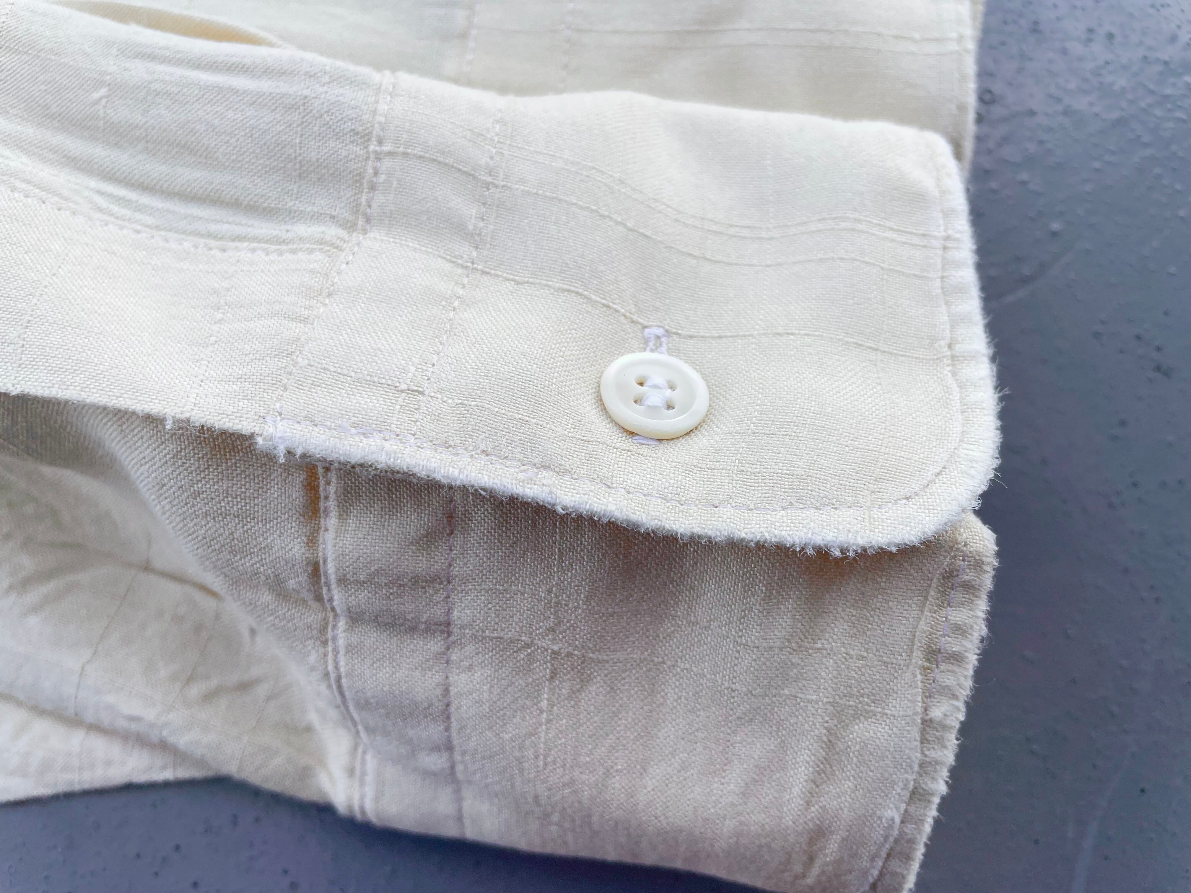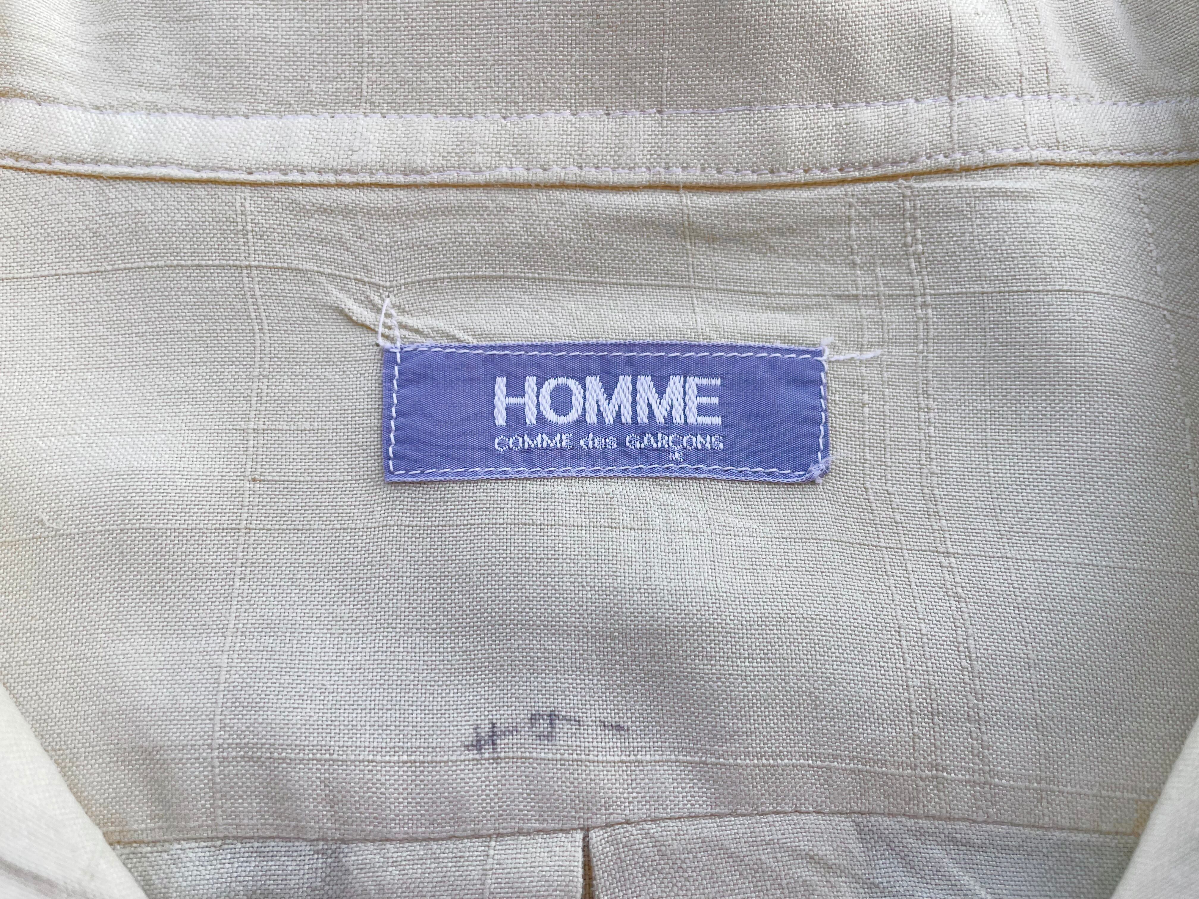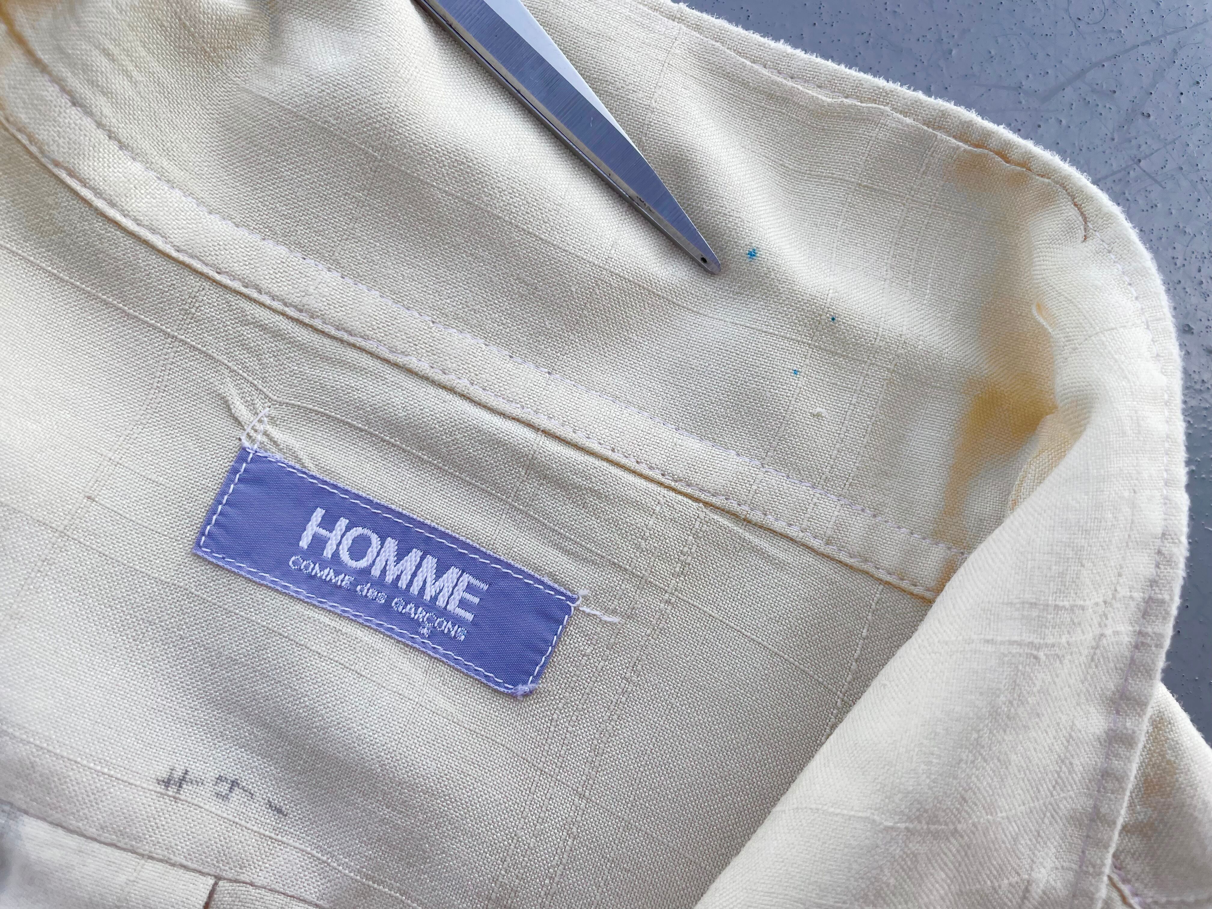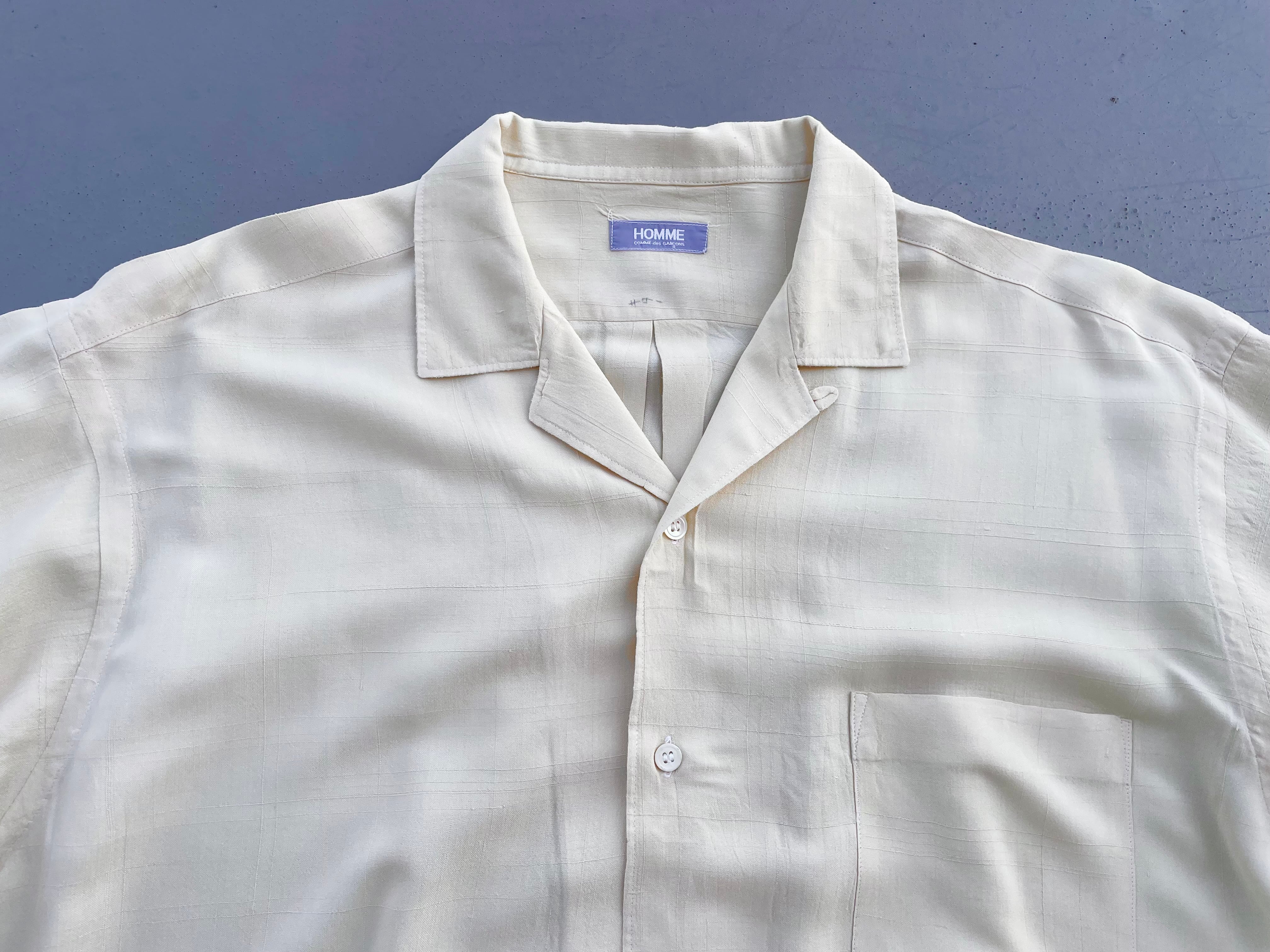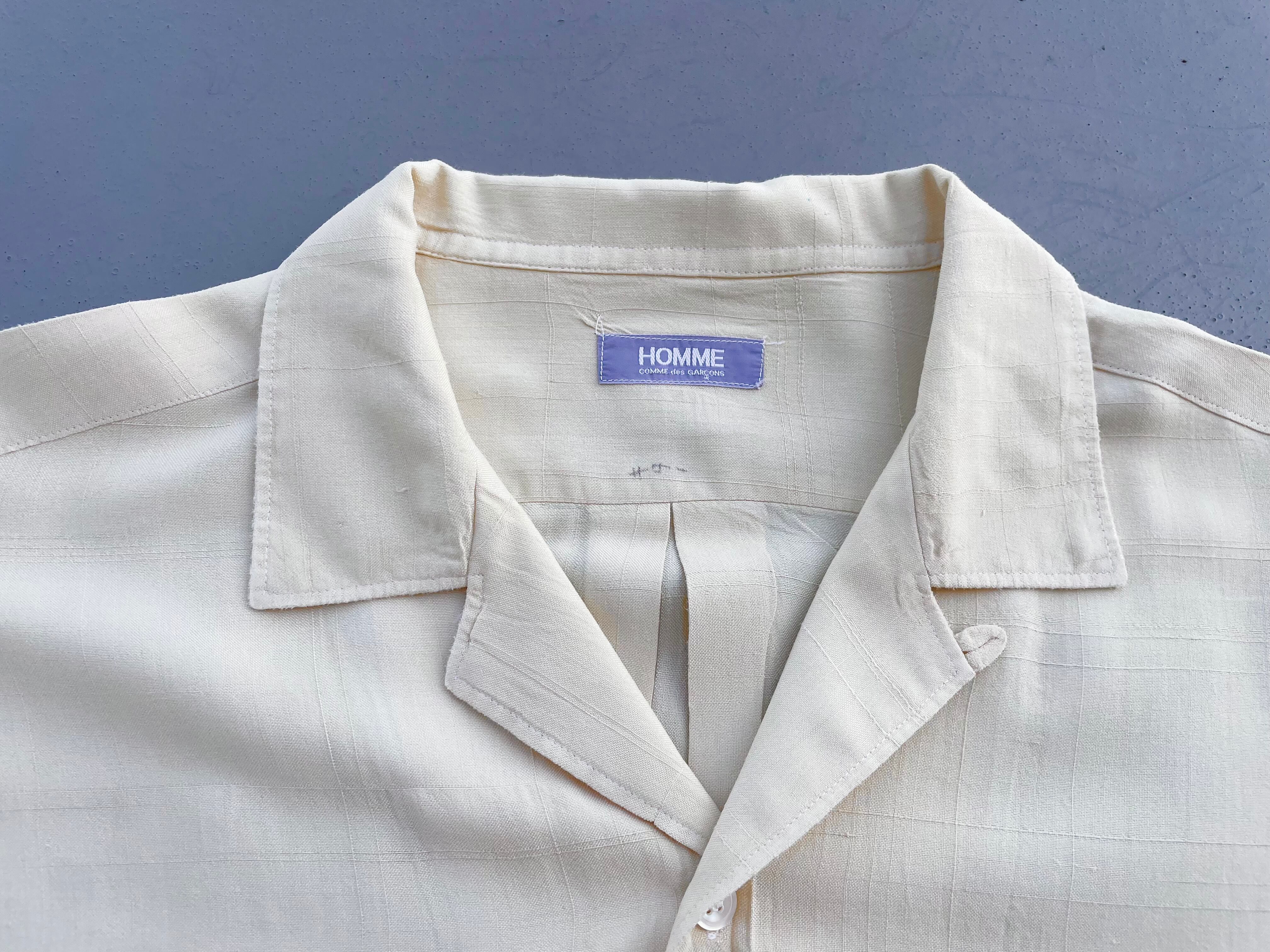 【商品詳細】コムデギャルソン オムのオープンカラー長袖シャツ。サイズはFREE。カラーはクリーム(ライトイエロー)。90年代日本製。田中オム期人気のシャツ物。こちらはクリームベースにカスリのようなチェックが薄く入る洒落たデザイン。全体的なディテールが大きく取られたドレープ感のあるギャルソンシルエット。
