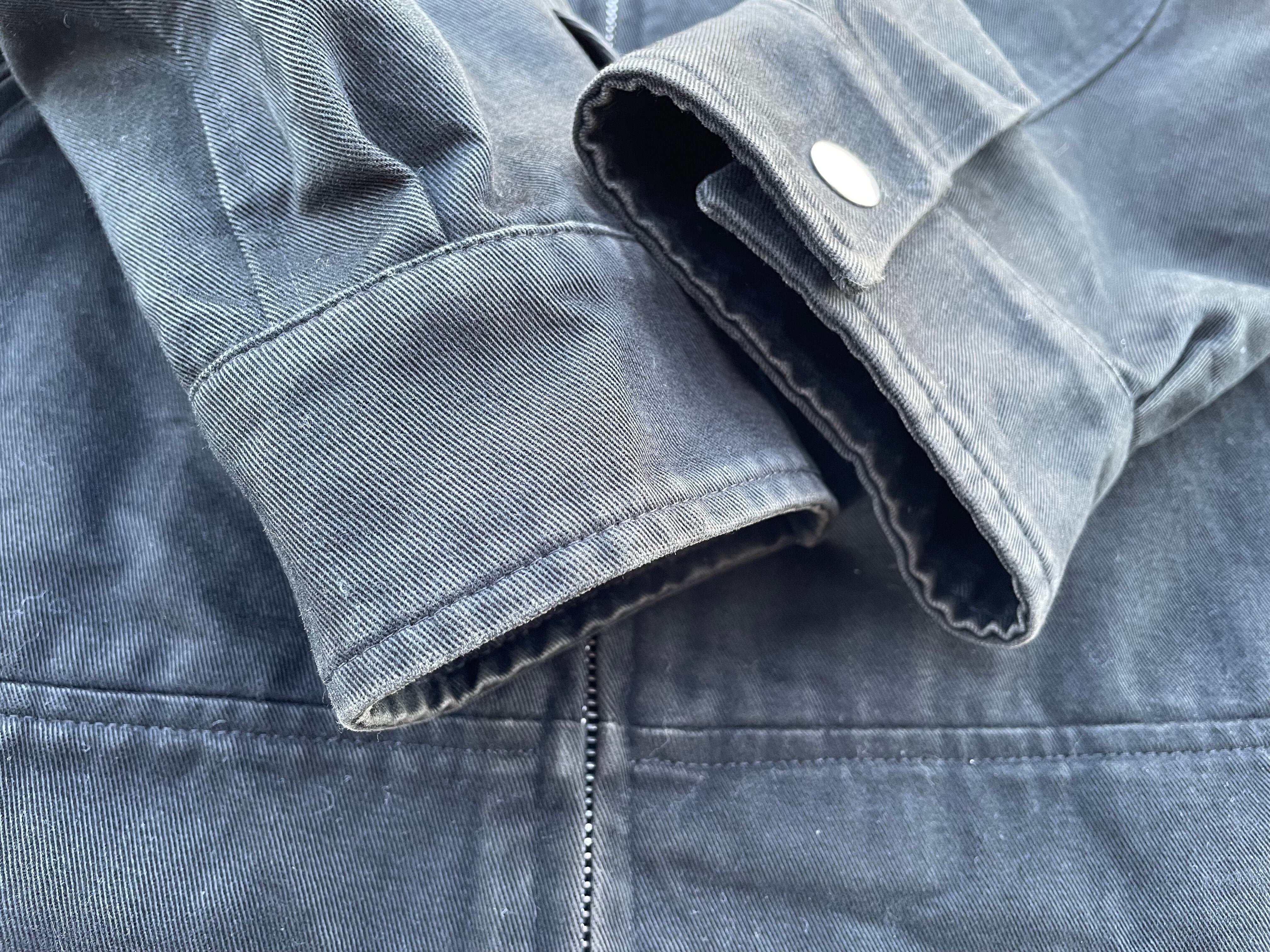 【商品詳細】アニエスベーのスタンドカラージャケット。生地はガシガシご着用いただけるコットン地。色も残ってます。人気の八の字モデル。これはかっこいいです。