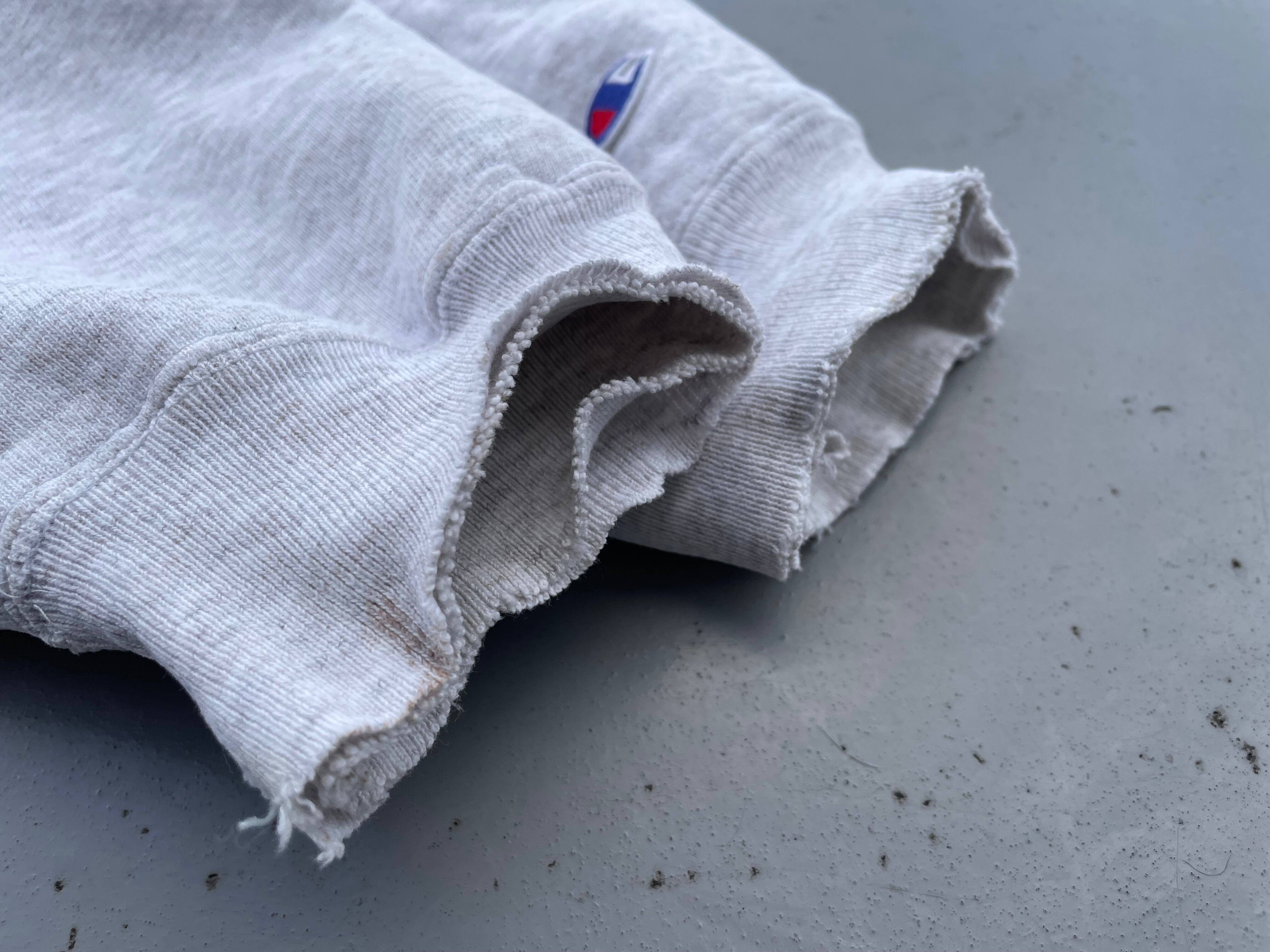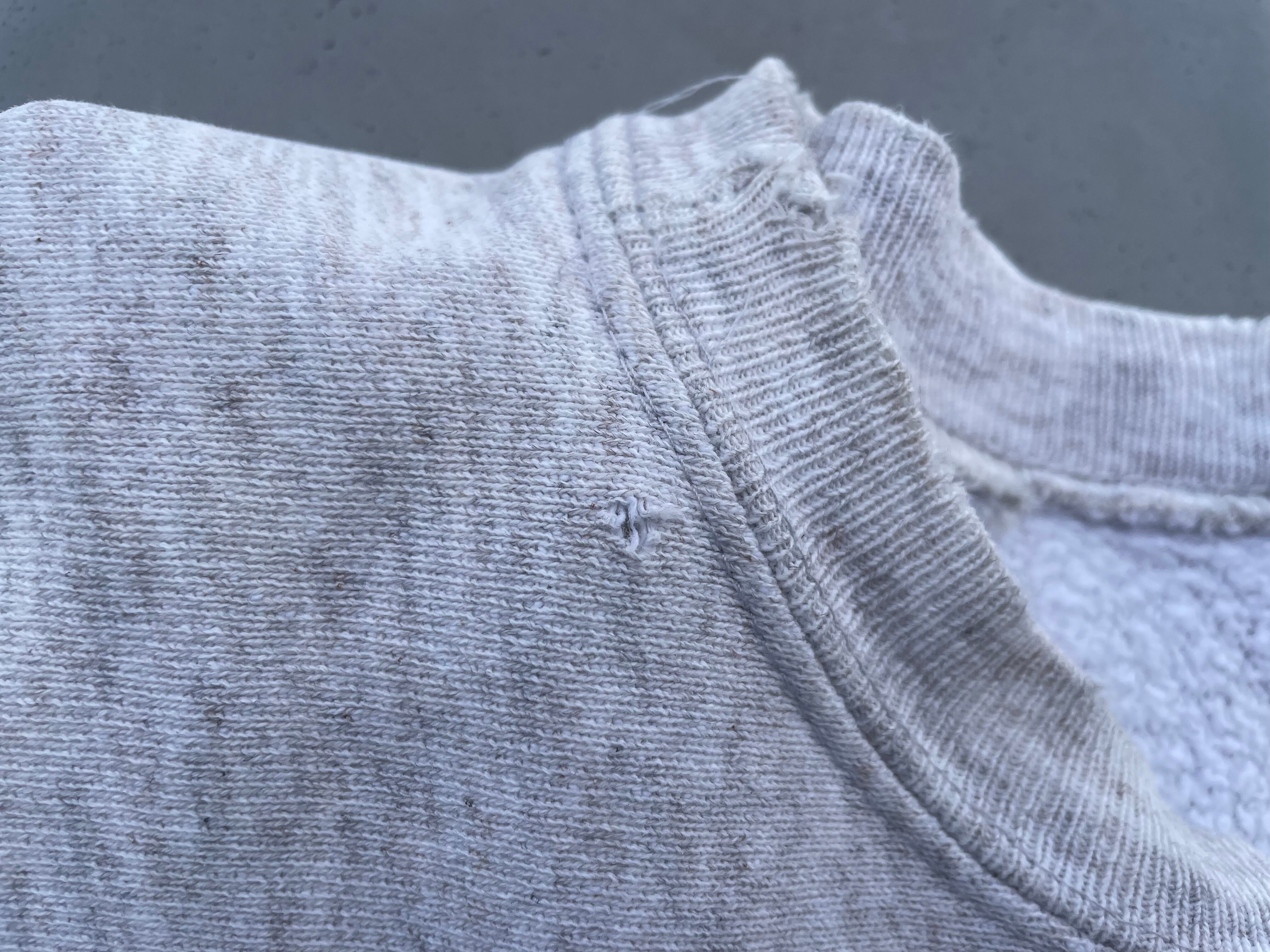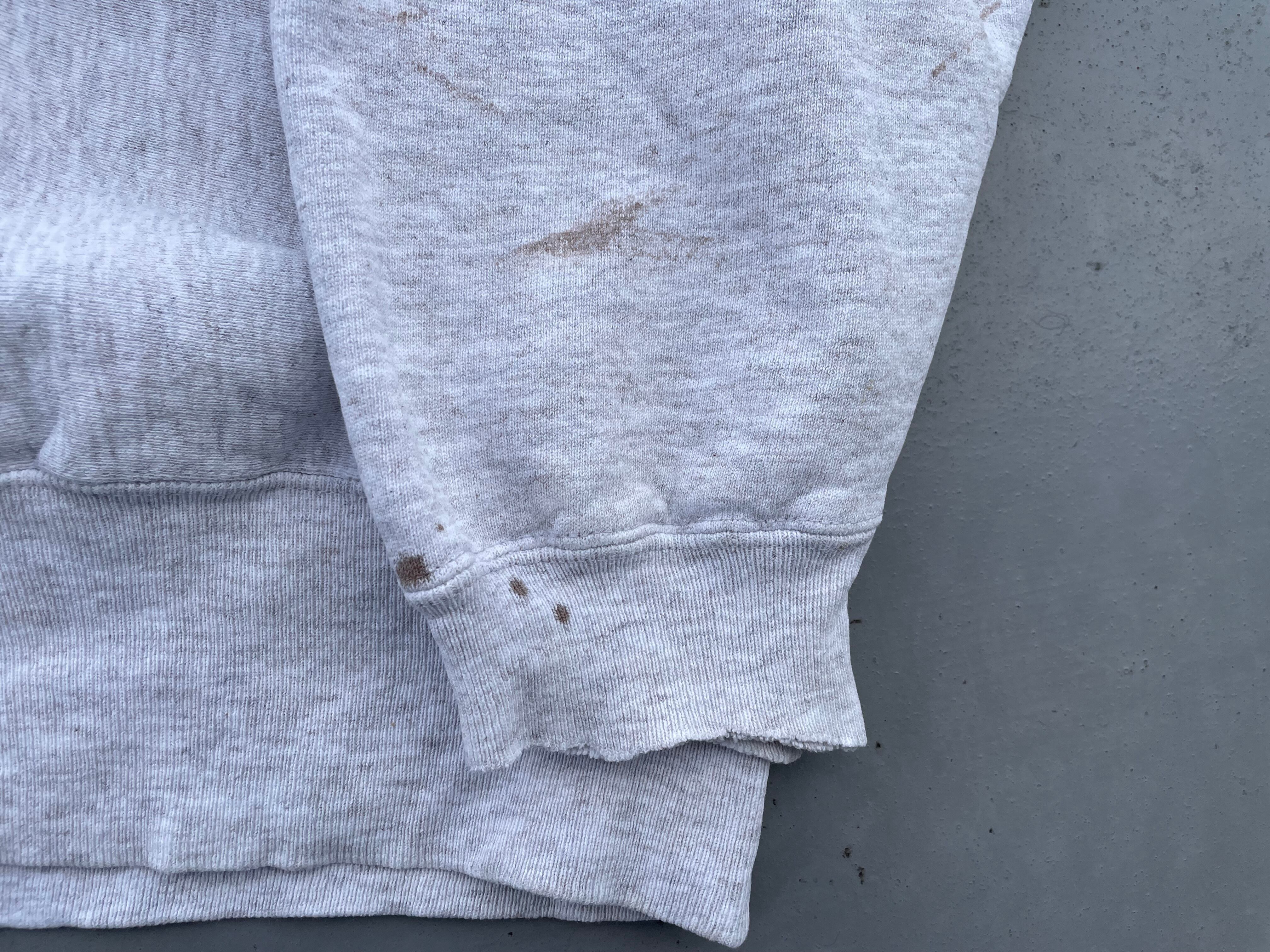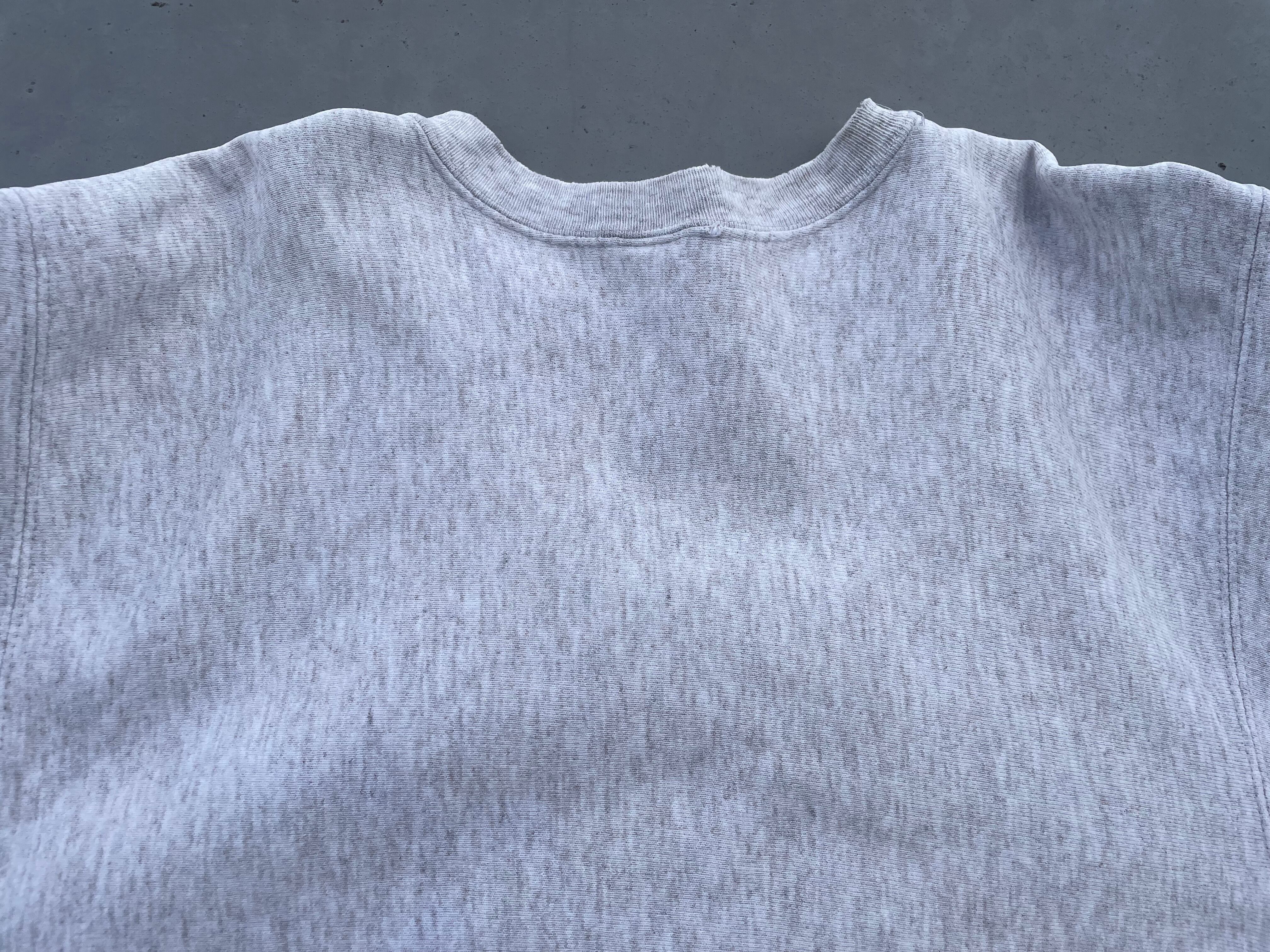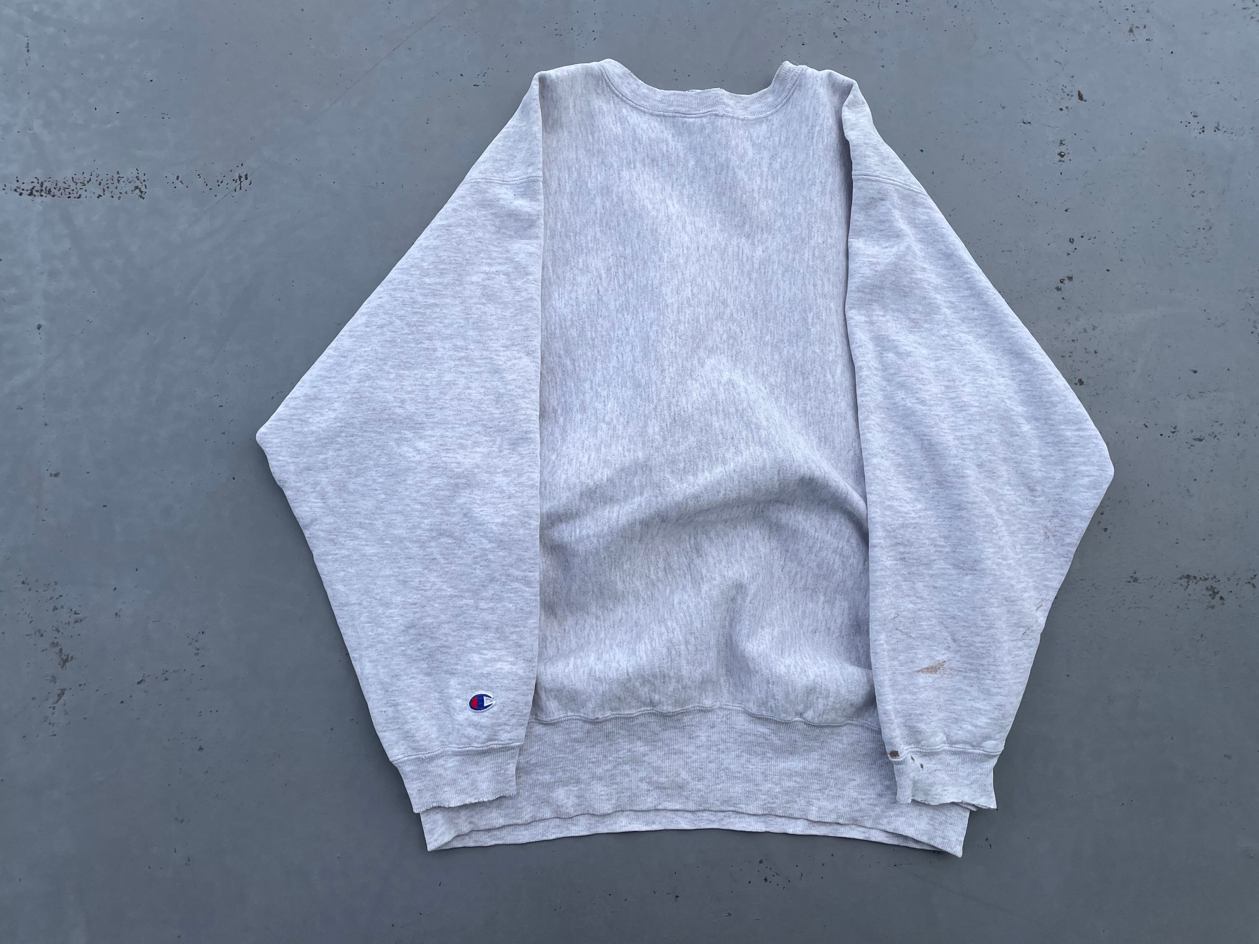 【商品詳細】90sチャンピオン リバースウィーブ。カラーは杢グレー。サイズはXL。USA製。2段プリント。ボロとまでは言いませんが、程よく使い込まれており良い雰囲気出てます。センタープリントのノートルダムが斜めに入っており、正に一点物かと。これは良いです。