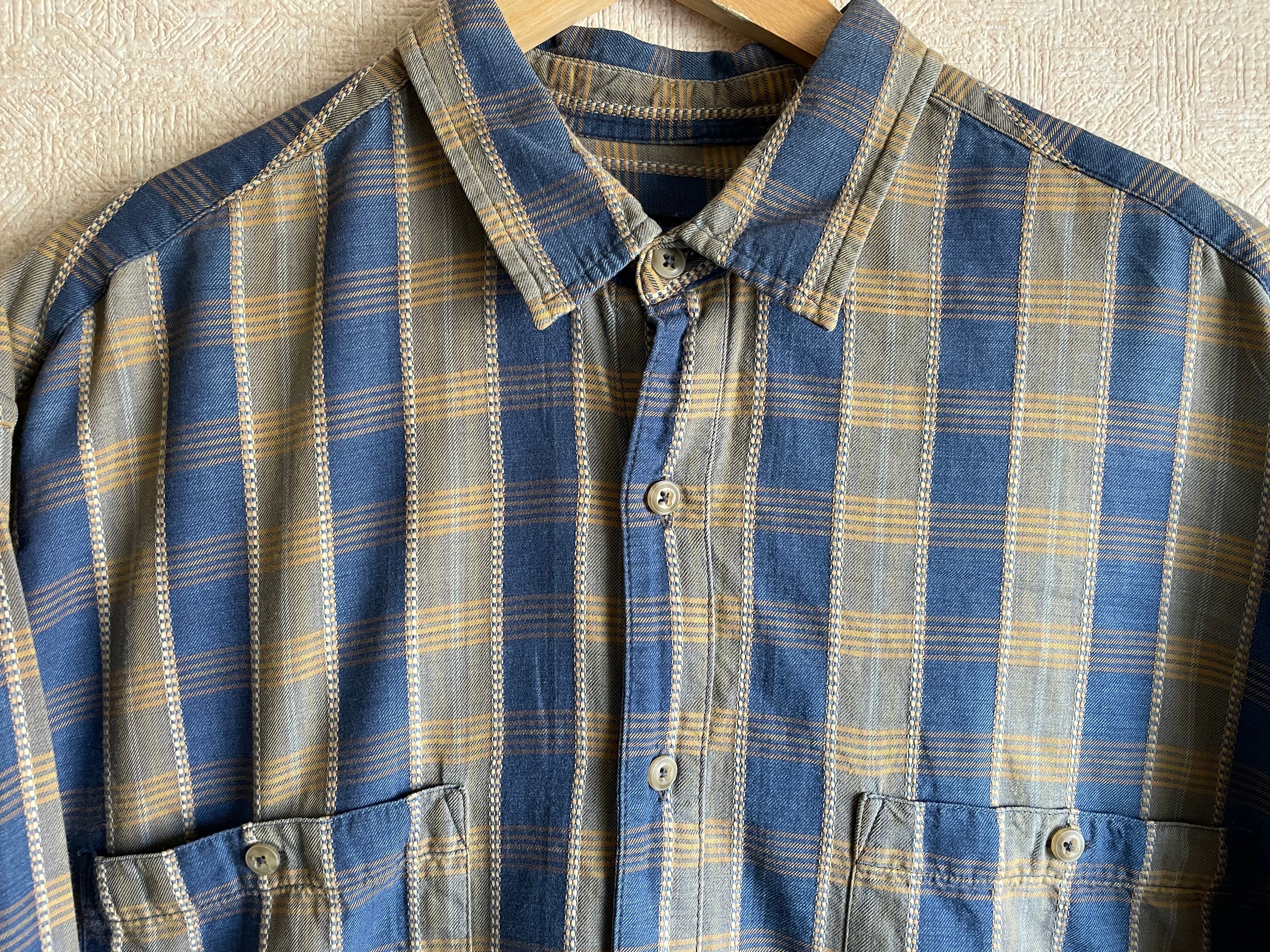 【商品詳細】パタゴニアのコットンチェックシャツ。カラーはブルー×カーキ×グレー。サイズはL。94年製雪無しタグ。全体に折りの入ったアウトドアブランドらしからぬ洒落たデザイン。これは良いです。