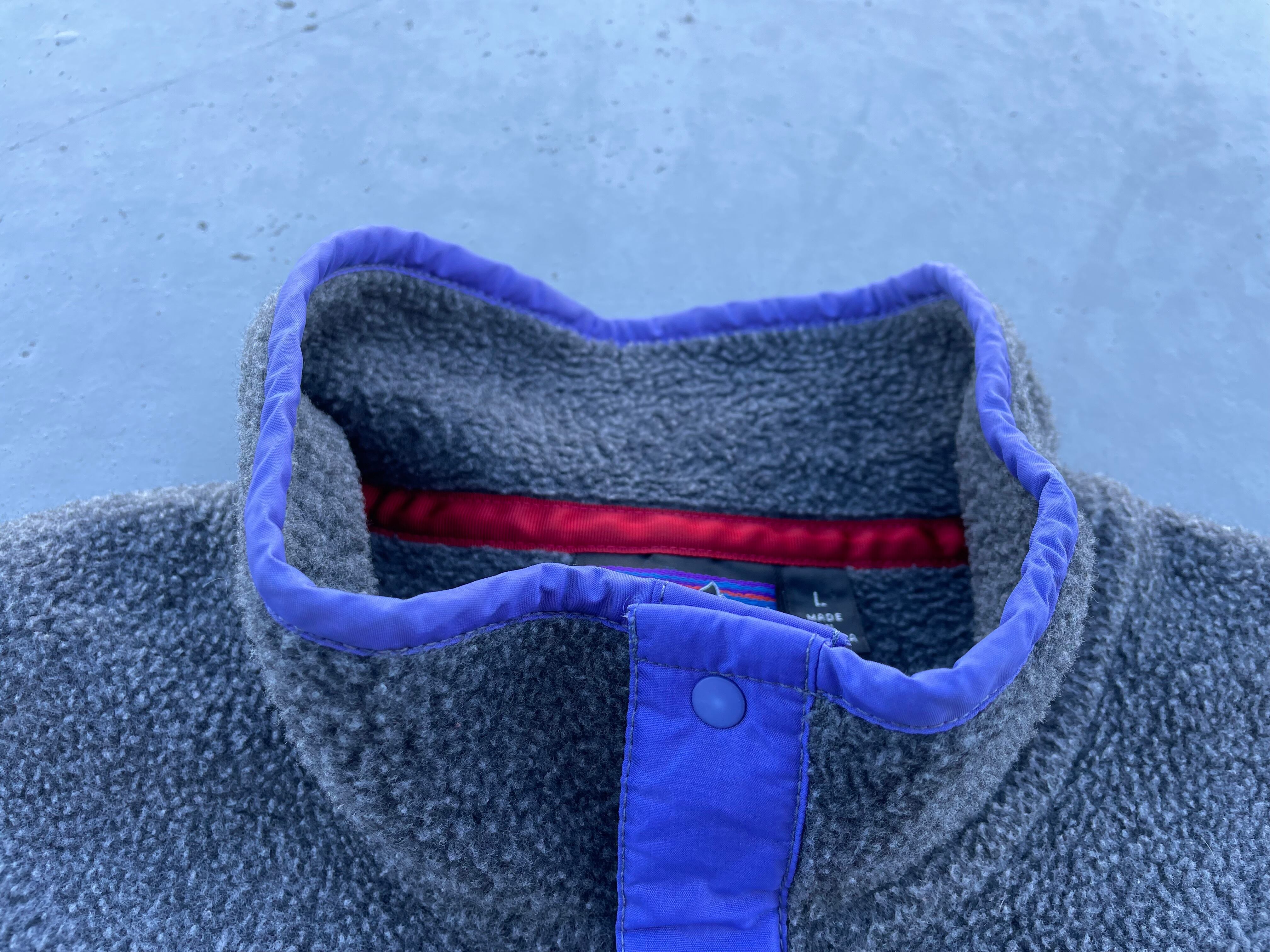 【商品詳細】パタゴニアのスナップT。カラーはチャコールヘザー。サイズはL。90年ジャマイカ製。古めのスナップTの中では比較的落ち着いた色味ですが雰囲気抜群です。年代物ですがフリース地ふかふかしてます。数あるスナップTの中でも大人味のある1着。