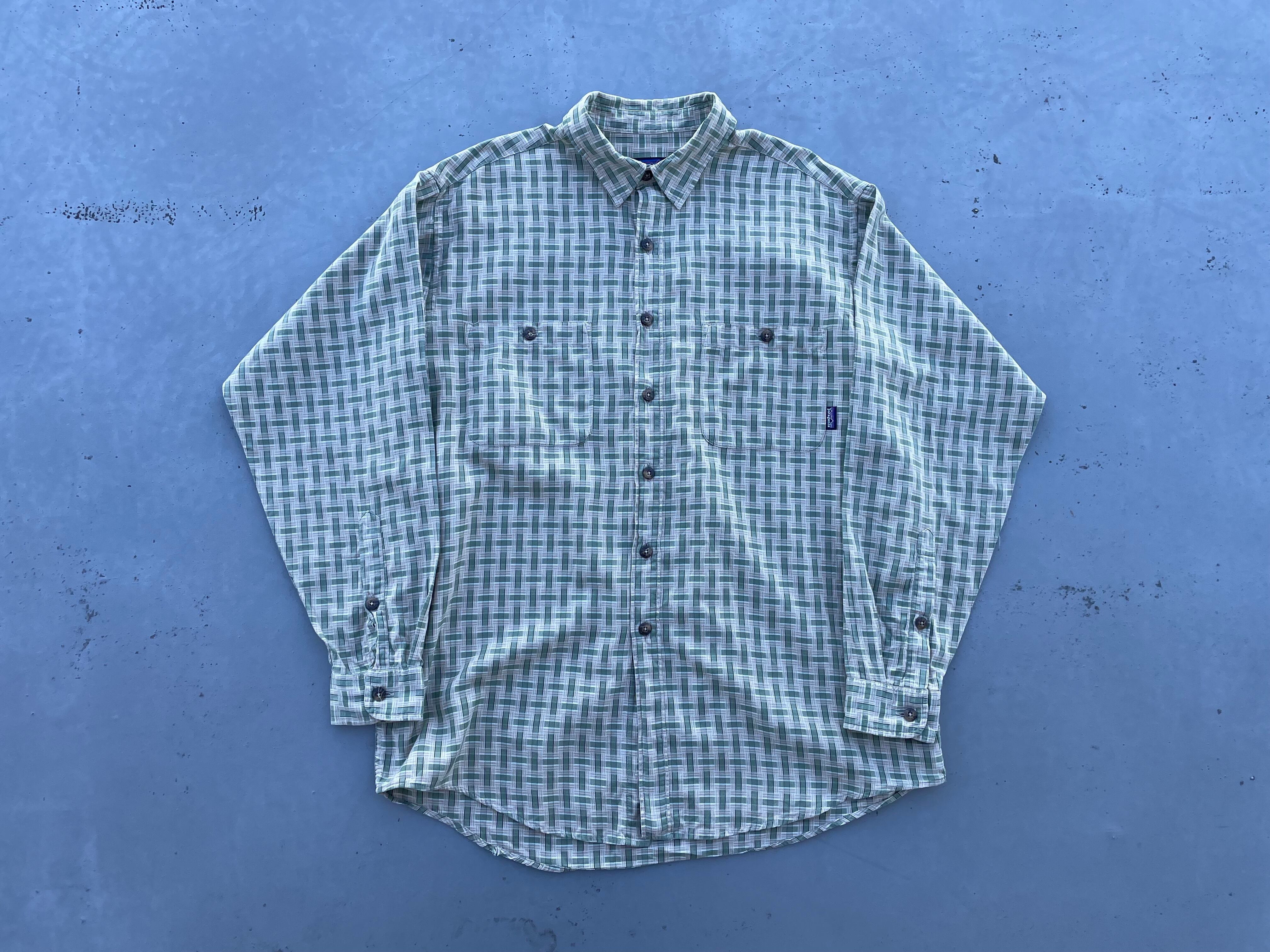 【商品詳細】パタゴニアのコットンチェックシャツ。カラーはグリーン×ベージュ×ホワイトミックス。サイズはM。97年製ポルトガル製。チェック調でありながらブロック毎にパターンが変わっている為、違和感のある洒落たデザイン。厚すぎない丁度良い厚みのコットン地で春先以降もご着用いただけます。